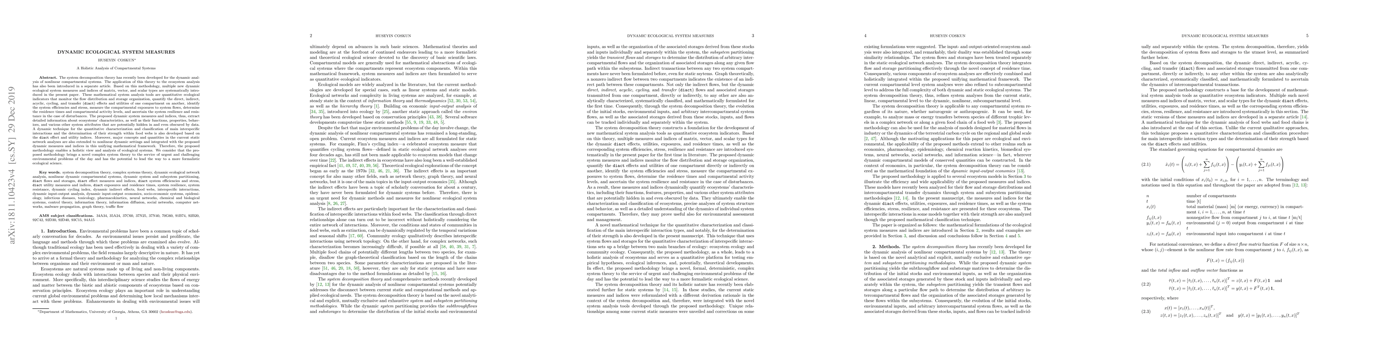 The system decomposition theory has recently been developed for the dynamic analysis of nonlinear compartmental systems. The application of this theory to the ecosystem analysis has also been introduced in a separate article. Based on this methodology, multiple new dynamic ecological system measures and indices of matrix, vector, and scalar types are systematically introduced in the present paper. These mathematical system analysis tools are quantitative ecological indicators that monitor the flow distribution and storage organization, quantify the direct, indirect, acyclic, cycling, and transfer (diact) effects and utilities of one compartment on another, identify the system efficiencies and stress, measure the compartmental exposures to system flows, determine the residence times and compartmental activity levels, and ascertain the system resilience and resistance in the case of disturbances. The proposed dynamic system measures and indices, thus, extract detailed information about ecosystems' characteristics, as well as their functions, properties, behaviors, and various other system attributes that are potentially hidden in and even obscured by data. A dynamic technique for the quantitative characterization and classification of main interspecific interactions and the determination of their strength within food webs is also developed based on the diact effect and utility indices. Moreover, major concepts and quantities in the current static network analyses are also extended to nonlinear dynamic settings and integrated with the proposed dynamic measures and indices in this unifying mathematical framework. We consider that the proposed methodology brings a novel complex system theory to the service of urgent and challenging environmental problems of the day and has the potential to lead the way to a more formalistic ecological science.