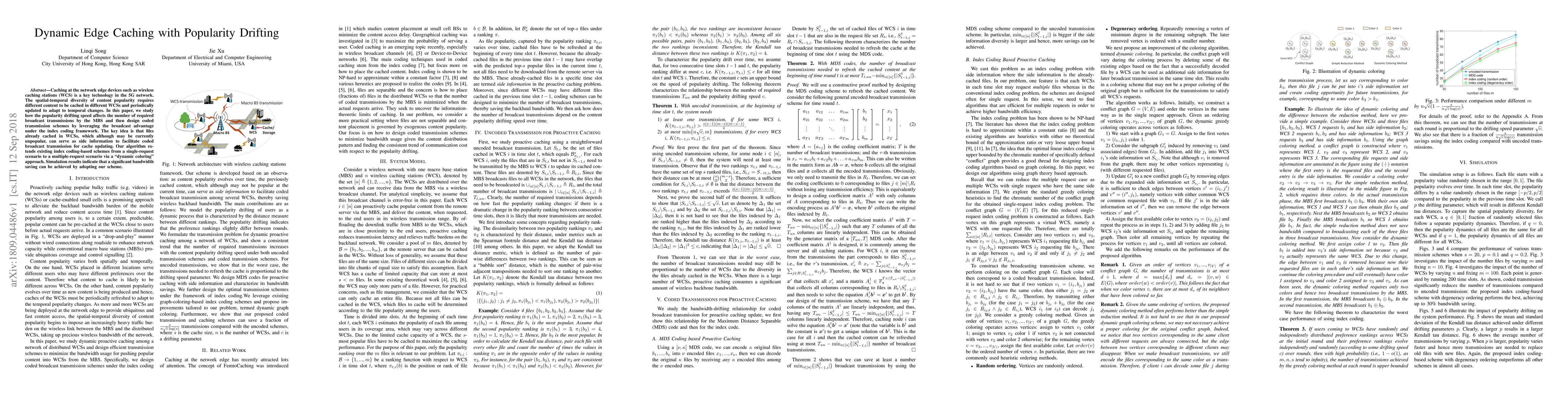 This paper explores dynamic edge caching strategies for wireless caching stations (WCS) in 5G networks, focusing on how popularity drifting affects broadcast transmissions. The proposed coded transmission scheme leverages index coding to optimize cache updates, significantly reducing bandwidth usage through a "dynamic coloring" approach.