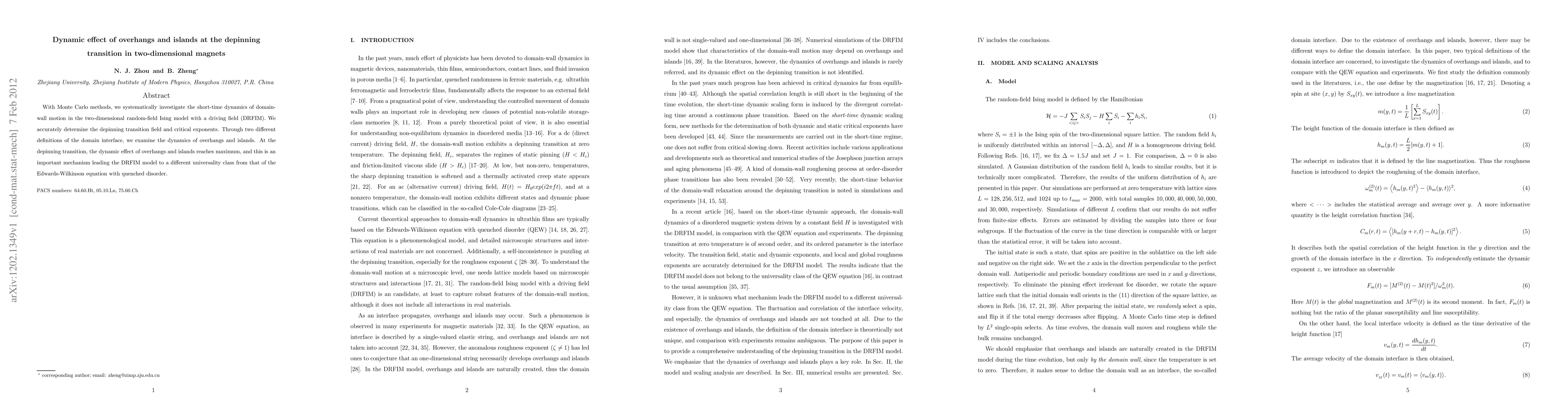 With the Monte Carlo methods, we systematically investigate the short-time dynamics of domain-wall motion in the two-dimensional random-field Ising model with a driving field ?DRFIM?. We accurately determine the depinning transition field and critical exponents. Through two different definitions of the domain interface, we examine the dynamics of overhangs and islands. At the depinning transition, the dynamic effect of overhangs and islands reaches maximum. We argue that this should be an important mechanism leading the DRFIM model to a different universality class from the Edwards-Wilkinson equation with quenched disorder