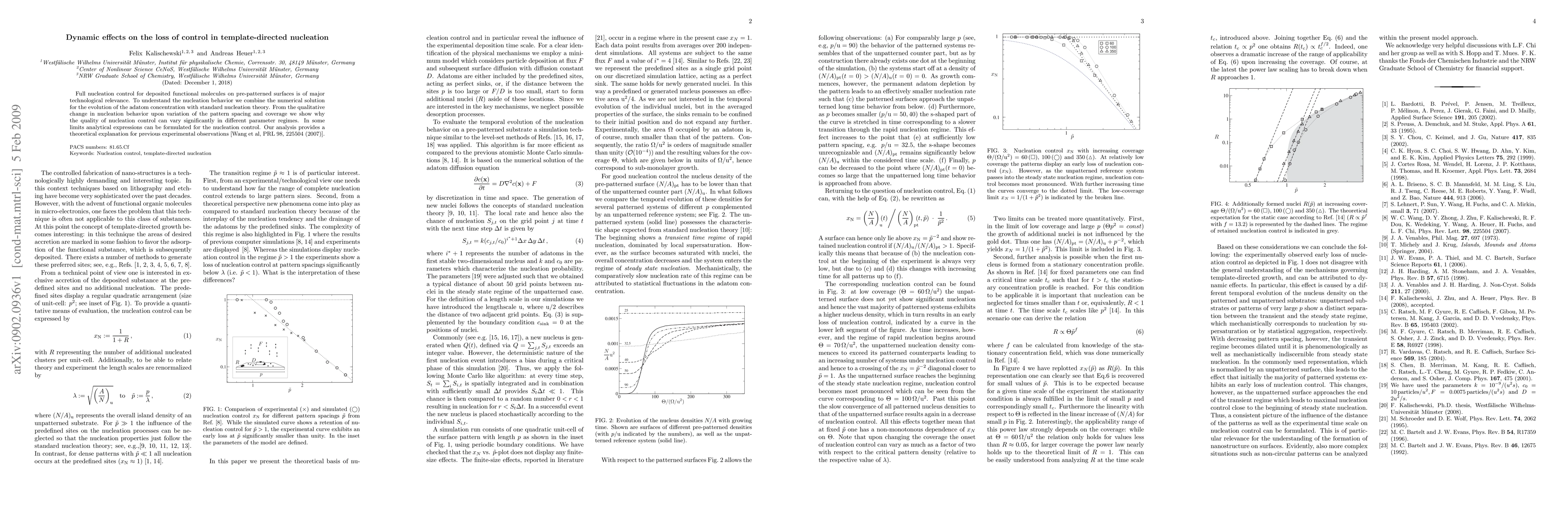 Full nucleation control for deposited functional molecules on pre-patterned surfaces is of major technological relevance. To understand the nucleation behavior we combine the numerical solution for the evolution of the adatom concentration with standard nucleation theory. From the qualitative change in nucleation behavior upon variation of the pattern spacing and coverage we show why the quality of nucleation control can vary significantly in different parameter regimes. In some limits analytical expressions can be formulated for the nucleation control. Our analysis provides a theoretical explanation for previous experimental observations [Wang et al, PRL 98, 225504 (2007)].