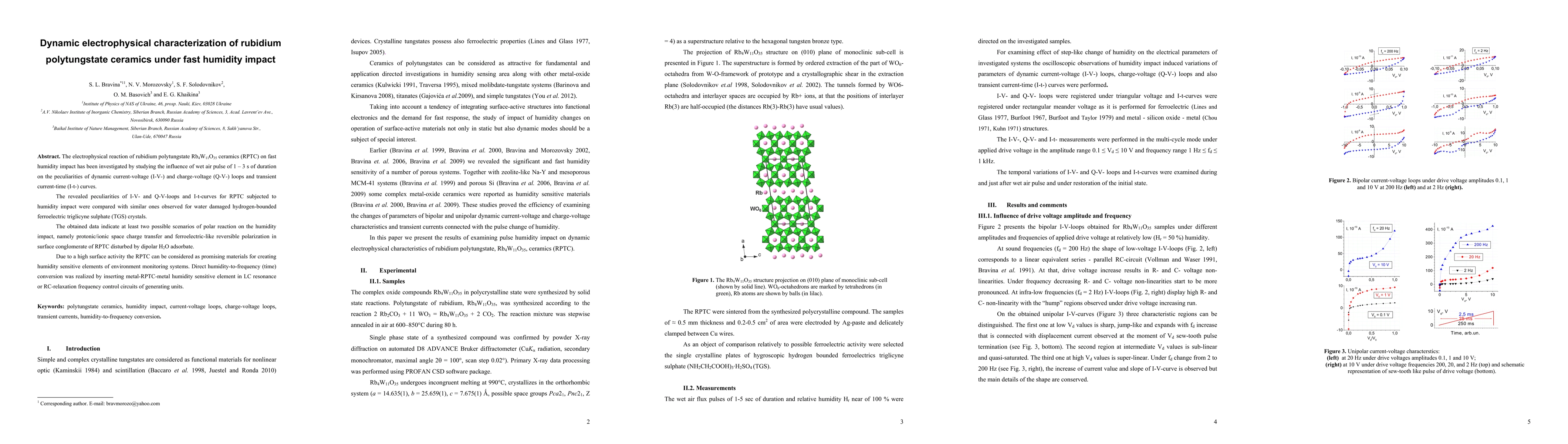 This paper explores the dynamic electrophysical responses of rubidium polytungstate ceramics (RPTC) to rapid humidity changes, revealing two potential polar reaction mechanisms: protonic/ionic space charge transfer and ferroelectric-like reversible polarization. The findings suggest RPTC's potential for humidity-sensitive applications in environmental monitoring systems.