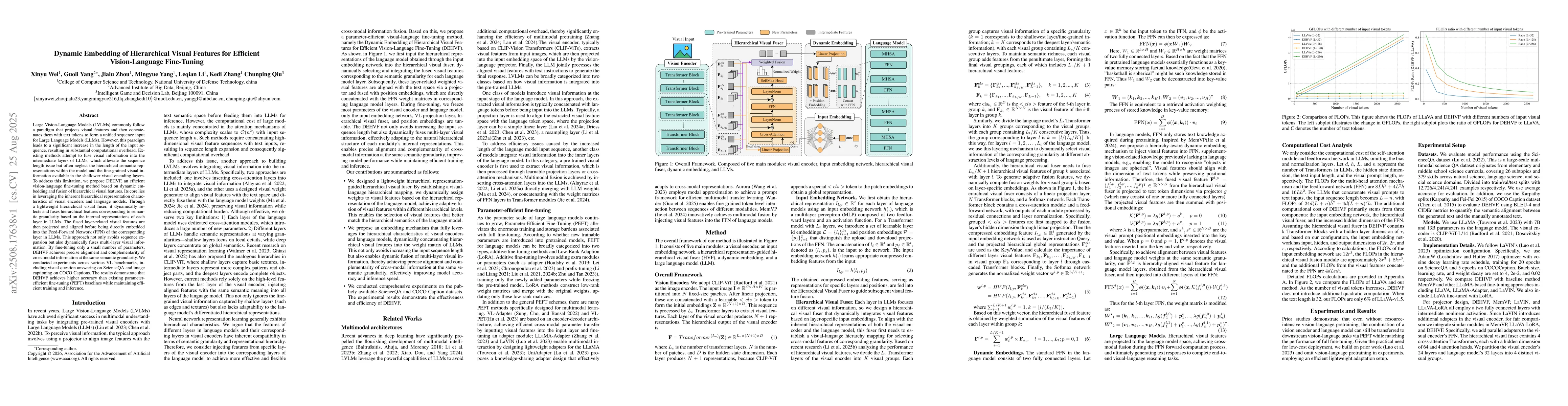 Large Vision-Language Models (LVLMs) commonly follow a paradigm that projects visual features and then concatenates them with text tokens to form a unified sequence input for Large Language Models (LLMs). However, this paradigm leads to a significant increase in the length of the input sequence, resulting in substantial computational overhead. Existing methods attempt to fuse visual information into the intermediate layers of LLMs, which alleviate the sequence length issue but often neglect the hierarchical semantic representations within the model and the fine-grained visual information available in the shallower visual encoding layers. To address this limitation, we propose DEHVF, an efficient vision-language fine-tuning method based on dynamic embedding and fusion of hierarchical visual features. Its core lies in leveraging the inherent hierarchical representation characteristics of visual encoders and language models. Through a lightweight hierarchical visual fuser, it dynamically selects and fuses hierarchical features corresponding to semantic granularity based on the internal representations of each layer in LLMs. The fused layer-related visual features are then projected and aligned before being directly embedded into the Feed-Forward Network (FFN) of the corresponding layer in LLMs. This approach not only avoids sequence expansion but also dynamically fuses multi-layer visual information. By fine-tuning only a small number of parameters, DEHVF achieves precise alignment and complementarity of cross-modal information at the same semantic granularity. We conducted experiments across various VL benchmarks, including visual question answering on ScienceQA and image captioning on COCO Captions. The results demonstrate that DEHVF achieves higher accuracy than existing parameter-efficient fine-tuning (PEFT) baselines while maintaining efficient training and inference.