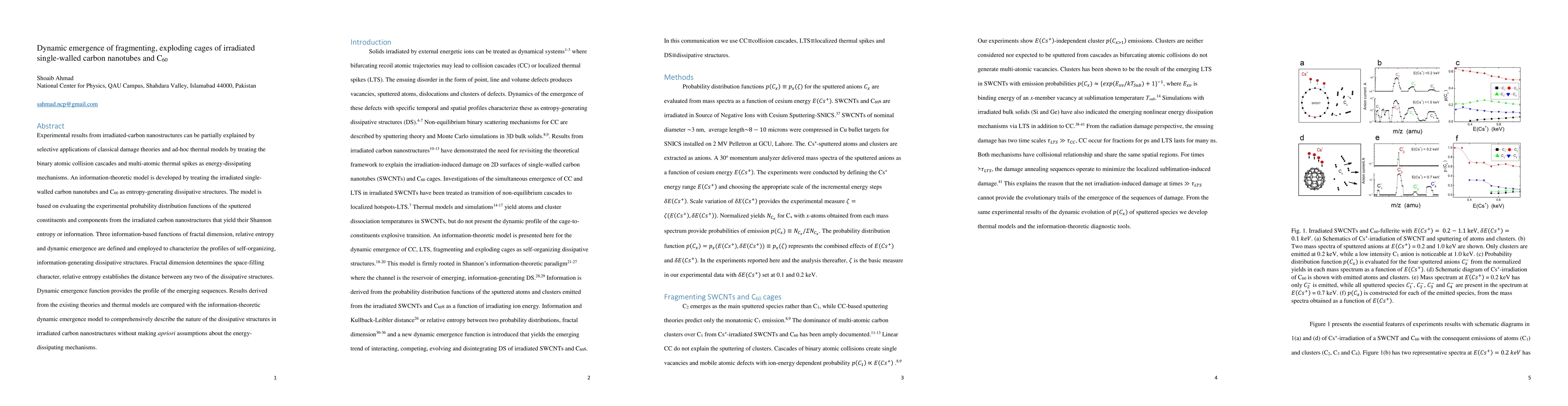 This paper develops an information-theoretic model to describe the dynamic emergence of fragmenting, exploding cages in irradiated single-walled carbon nanotubes and C60, using fractal dimension, relative entropy, and dynamic emergence functions to characterize their self-organizing behavior, without relying on classical damage theories or thermal models. The model comprehensively explains the nature of these dissipative structures based on experimental probability distributions.