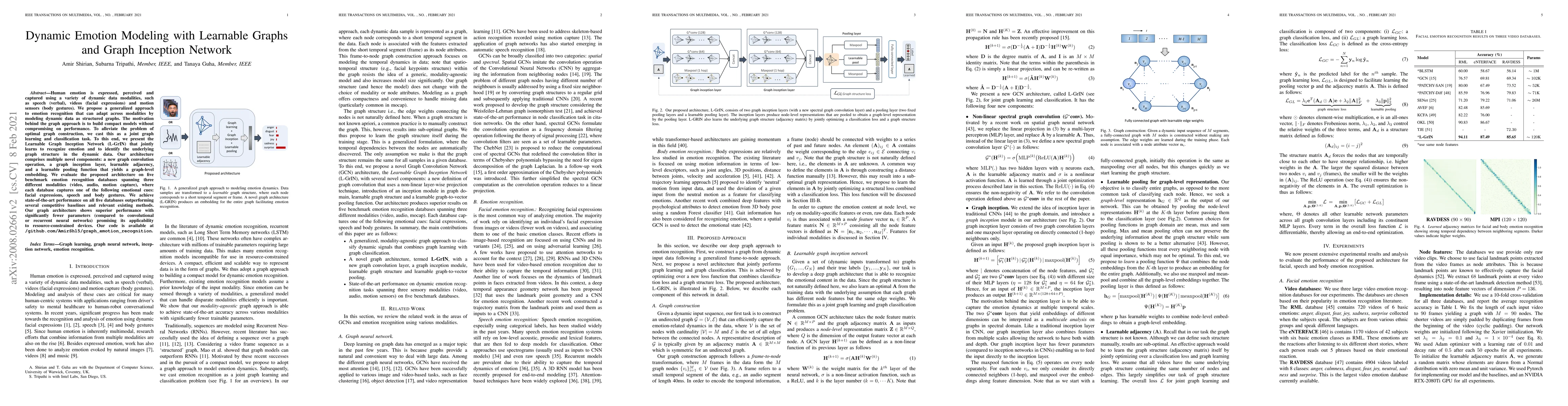 Human emotion is expressed, perceived and captured using a variety of dynamic data modalities, such as speech (verbal), videos (facial expressions) and motion sensors (body gestures). We propose a generalized approach to emotion recognition that can adapt across modalities by modeling dynamic data as structured graphs. The motivation behind the graph approach is to build compact models without compromising on performance. To alleviate the problem of optimal graph construction, we cast this as a joint graph learning and classification task. To this end, we present the Learnable Graph Inception Network (L-GrIN) that jointly learns to recognize emotion and to identify the underlying graph structure in the dynamic data. Our architecture comprises multiple novel components: a new graph convolution operation, a graph inception layer, learnable adjacency, and a learnable pooling function that yields a graph-level embedding. We evaluate the proposed architecture on five benchmark emotion recognition databases spanning three different modalities (video, audio, motion capture), where each database captures one of the following emotional cues: facial expressions, speech and body gestures. We achieve state-of-the-art performance on all five databases outperforming several competitive baselines and relevant existing methods. Our graph architecture shows superior performance with significantly fewer parameters (compared to convolutional or recurrent neural networks) promising its applicability to resource-constrained devices.