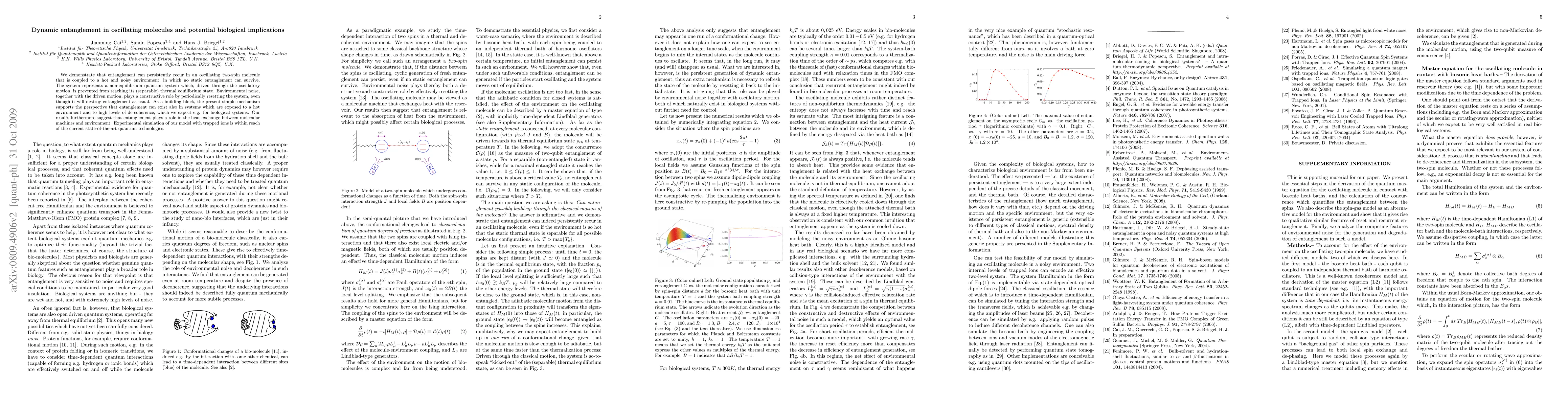 This paper demonstrates persistent dynamic entanglement in an oscillating two-spin molecule coupled to a noisy environment, suggesting that entanglement can exist in non-equilibrium systems exposed to high decoherence levels, potentially relevant for biological systems. The findings imply entanglement's role in heat exchange between molecular machines and their environment.