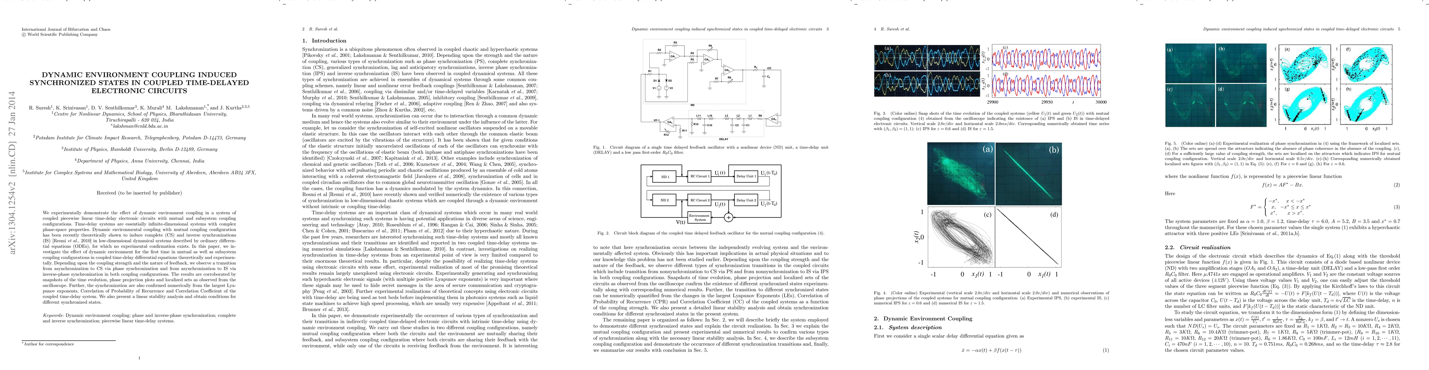 We experimentally demonstrate the occurrence of various synchronized states in coupled piece-wise linear time-delayed electronic circuits using dynamic environment coupling where the environment has its own intrinsic dynamics via feedback from the circuits. We carry out these experiments in two different coupling configurations, namely mutual and subsystem coupling configurations. Depending upon the coupling strength and the nature of feedback, we observe a transition from nonsynchronization to complete synchronization via phase synchronization and from nonsynchronization to inverse synchronization via inverse-phase synchronization between the circuits in hyperchaotic regime. Snapshots of the time evolution, phase projection plots and localized sets of the circuits as observed experimentally from the oscilloscope, along with supporting numerical simulations confirm the existence of different synchronized states. Further, the transition to different synchronized states can be verified from the changes in the largest Lyapunov exponents, Correlation of Probability of Recurrence and Correlation Coefficient as a function of the coupling strength. We present a detailed linear stability analysis and obtain conditions for different synchronized states.
