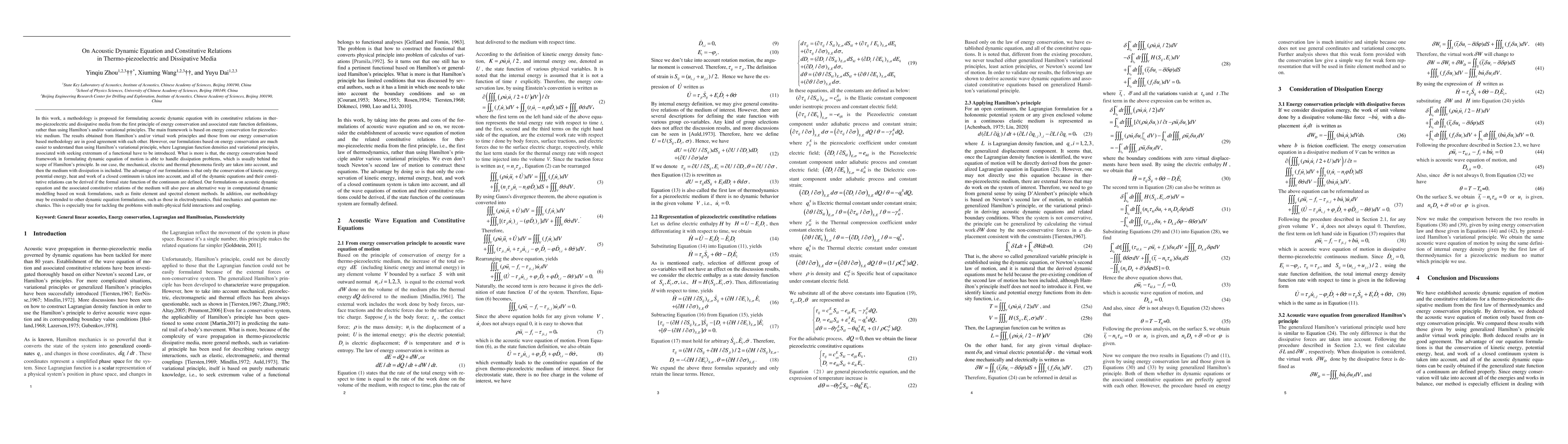 A methodology is proposed for formulating dynamic equations in thermo-piezoelectric and dissipative media from the first principle of energy conservation. The results are in agreement with those from Hamiltonian principle. Our formulations based on energy conservation are much easier to understand. What is more is that, the energy conservation based framework is able to handle dissipation problems, which is usually behind the scope of Hamiltonian principle. In our case, the mechanical, electric and thermal phenomena firstly are taken into account, and then the medium with dissipation is included. The formulations on acoustic dynamic equation and the associated constitutive relations of the medium will also pave an alternative way in computational dynamic modelling based on weak formulations. In addition, our methodology may be extended to other dynamic equation formulations, such as in electrodynamics, fluid mechanics and quantum mechanics. This is especially true for tackling the problems with multi-physical field interactions and coupling.