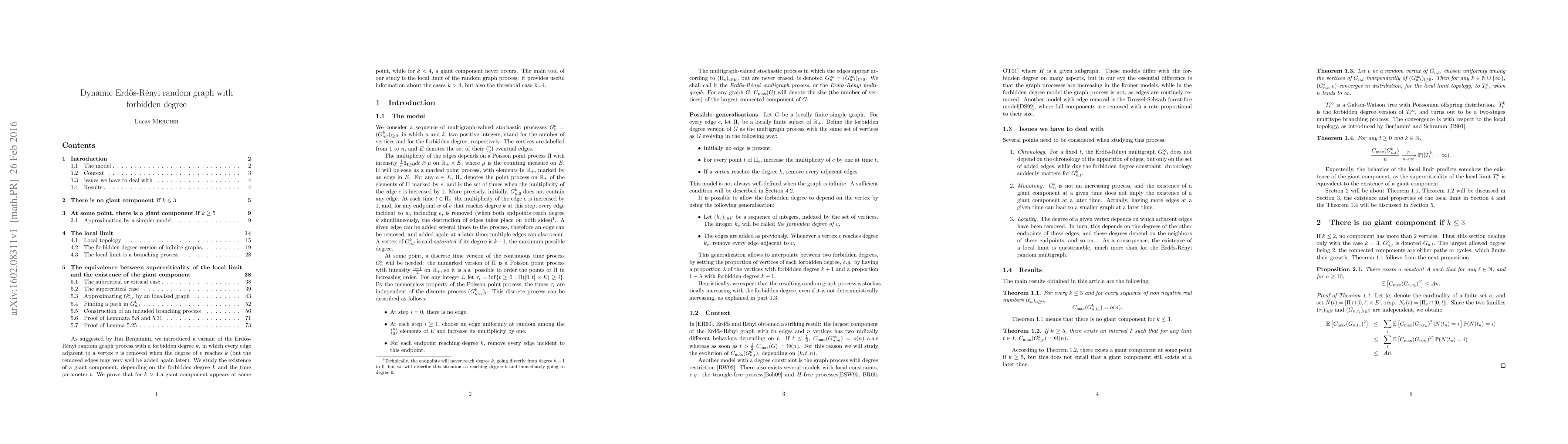 A new type of random graph process with a forbidden degree threshold was studied, finding that for degrees above 4, a giant component appears at some point, while below 4 it never occurs.