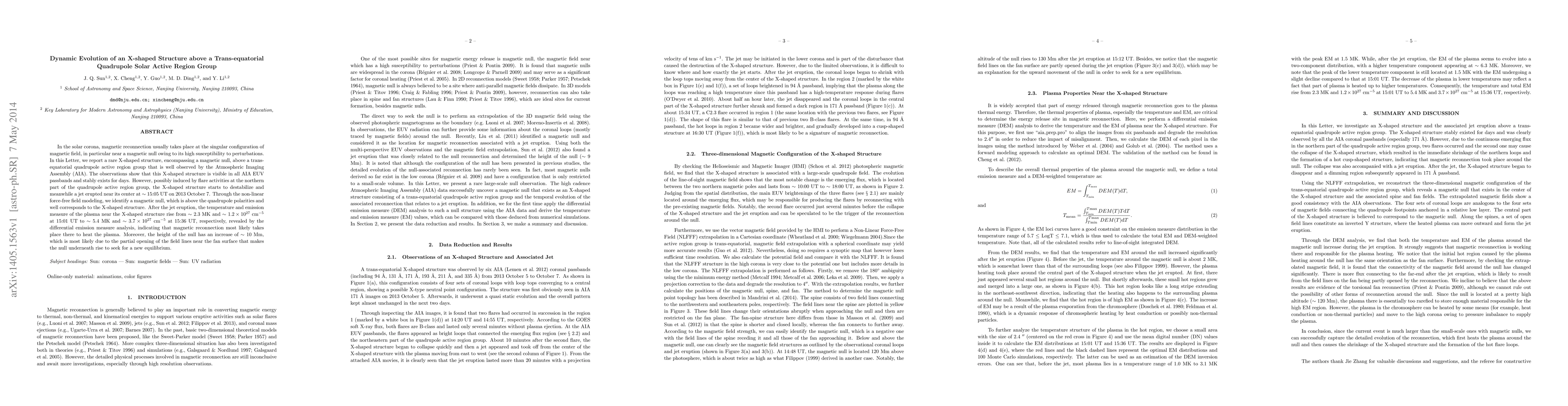 In the solar corona, magnetic reconnection usually takes place at the singular configuration of magnetic field, in particular near a magnetic null owing to its high susceptibility to perturbations. In this Letter, we report a rare X-shaped structure, encompassing a magnetic null, above a trans-equatorial quadrupole active region group that is well observed by the Atmospheric Imaging Assembly (AIA). The observations show that this X-shaped structure is visible in all AIA EUV passbands and stably exists for days. However, possibly induced by flare activities at the northern part of the quadrupole active region group, the X-shaped structure starts to destabilize and meanwhile a jet erupted near its center at 15:05 UT on 2013 October 7. Through the non-linear force-free field modeling, we identify a magnetic null, which is above the quadrupole polarities and well corresponds to the X-shaped structure. After the jet eruption, the temperature and emission measure of the plasma near the X-shaped structure rise from 2.3 MK and 1.2x10^27 cm-5 at 15:01 UT to 5.4 MK and 3.7x10^27 cm-5 at 15:36 UT, respectively, revealed by the differential emission measure analysis, indicating that magnetic reconnection most likely takes place there to heat the plasma. Moreover, the height of the null has an increase of 10 Mm, which is most likely due to the partial opening of the field lines near the fan surface that makes the null underneath rise to seek for a new equilibrium.