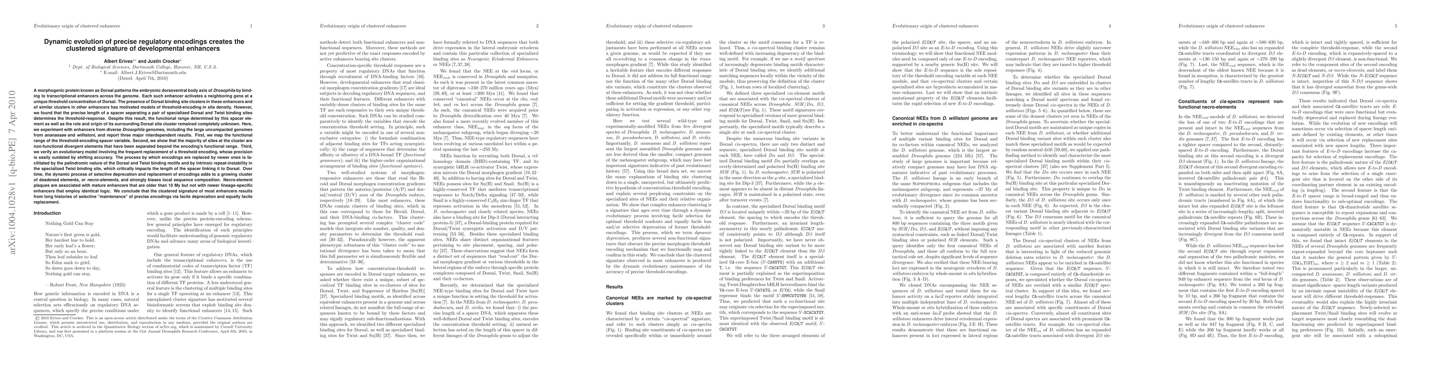 A morphogenic protein known as Dorsal patterns the embryonic dorsoventral body axis of Drosophila by binding to transcriptional enhancers across the genome. Each such enhancer activates a neighboring gene at a unique threshold concentration of Dorsal. The presence of Dorsal binding site clusters in these enhancers and of similar clusters in other enhancers has motivated models of threshold-encoding in site density. However, we found that the precise length of a spacer separating a pair of specialized Dorsal and Twist binding sites determines the threshold-response. Despite this result, the functional range determined by this spacer element as well as the role and origin of its surrounding Dorsal site cluster remained completely unknown. Here, we experiment with enhancers from diverse Drosophila genomes, including the large uncompacted genomes from ananassae and willistoni, and report three major interdependent results. First, we map the functional range of the threshold-encoding spacer variable. Second, we show that the majority of sites at the cluster are non-functional divergent elements that have been separated beyond the encoding's functional range. Third, we verify an evolutionary model involving the frequent replacement of a threshold encoding, whose precision is easily outdated by shifting accuracy. The process by which encodings are replaced by newer ones is facilitated by the palindromic nature of the Dorsal and Twist binding motifs and by intrinsic repeat-instability in the specialized Twist binding site, which critically impacts the length of the spacer linking it to Dorsal. Over time, the dynamic process of selective deprecation and replacement of encodings adds to a growing cluster of deadened elements, or necro-elements, and strongly biases local sequence composition. ... [ABSTRACT TRUNCATED]