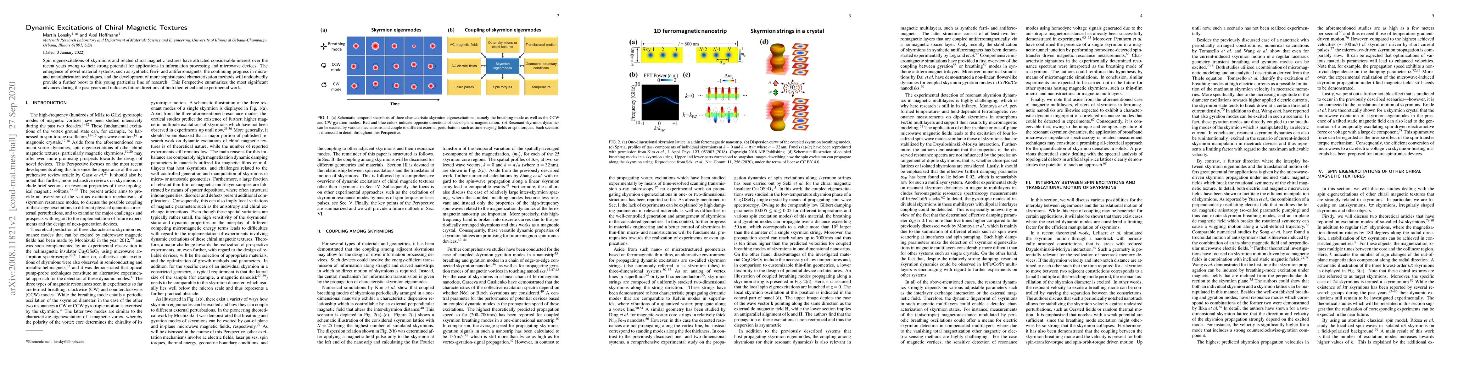 Spin eigenexcitations of skyrmions and related chiral magnetic textures have attracted considerable interest over the recent years owing to their strong potential for applications in information processing and microwave devices. The emergence of novel material systems, such as synthetic ferri- and antiferromagnets, the continuing progress in micro- and nanofabrication techniques, and the development of more sophisticated characterization methods will undoubtedly provide a further boost to this young particular line of research. This Perspective summarizes the most significant advances during the past years and indicates future directions of both theoretical and experimental work.