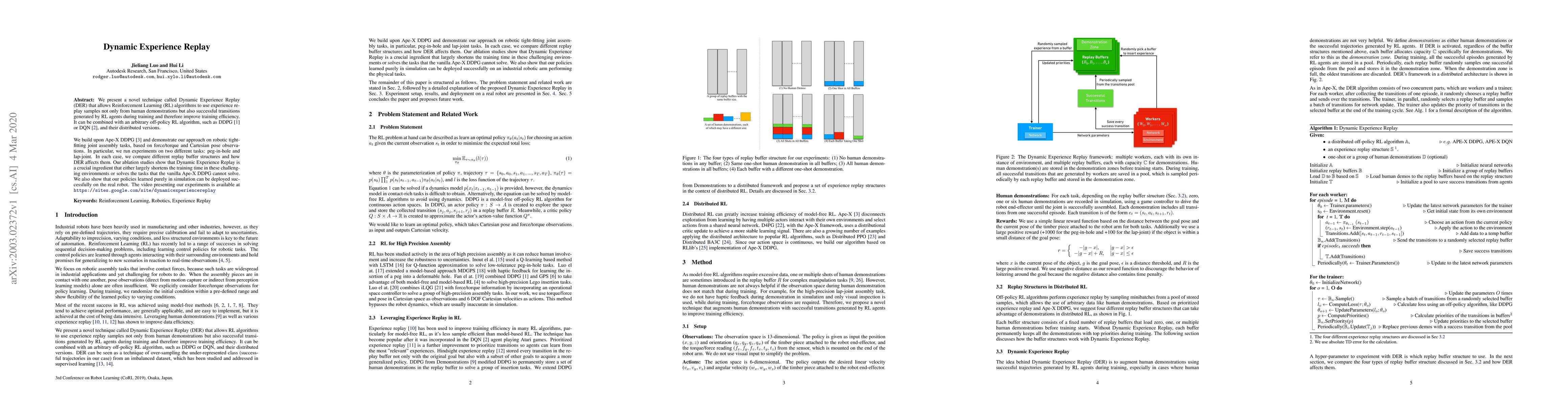 We present a novel technique called Dynamic Experience Replay (DER) that allows Reinforcement Learning (RL) algorithms to use experience replay samples not only from human demonstrations but also successful transitions generated by RL agents during training and therefore improve training efficiency. It can be combined with an arbitrary off-policy RL algorithm, such as DDPG or DQN, and their distributed versions. We build upon Ape-X DDPG and demonstrate our approach on robotic tight-fitting joint assembly tasks, based on force/torque and Cartesian pose observations. In particular, we run experiments on two different tasks: peg-in-hole and lap-joint. In each case, we compare different replay buffer structures and how DER affects them. Our ablation studies show that Dynamic Experience Replay is a crucial ingredient that either largely shortens the training time in these challenging environments or solves the tasks that the vanilla Ape-X DDPG cannot solve. We also show that our policies learned purely in simulation can be deployed successfully on the real robot. The video presenting our experiments is available at https://sites.google.com/site/dynamicexperiencereplay