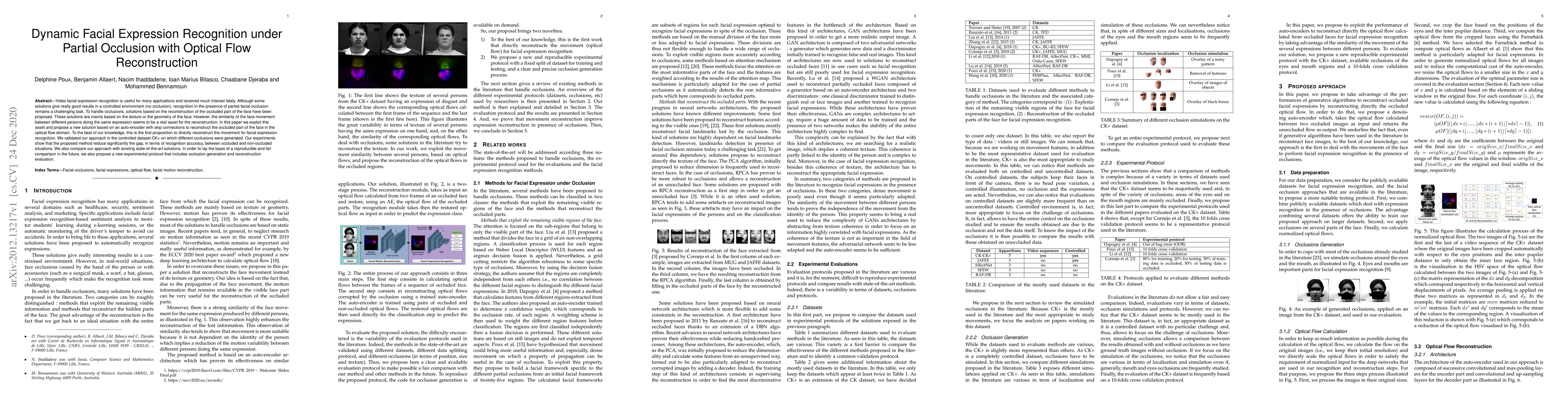 This paper proposes a novel auto-encoder with skip connections to reconstruct occluded facial regions using optical flow, aiming to improve dynamic facial expression recognition under partial occlusion. The method significantly reduces recognition accuracy discrepancies between occluded and non-occluded scenarios, validated on the CK+ dataset, and introduces a new experimental protocol for future comparisons.
