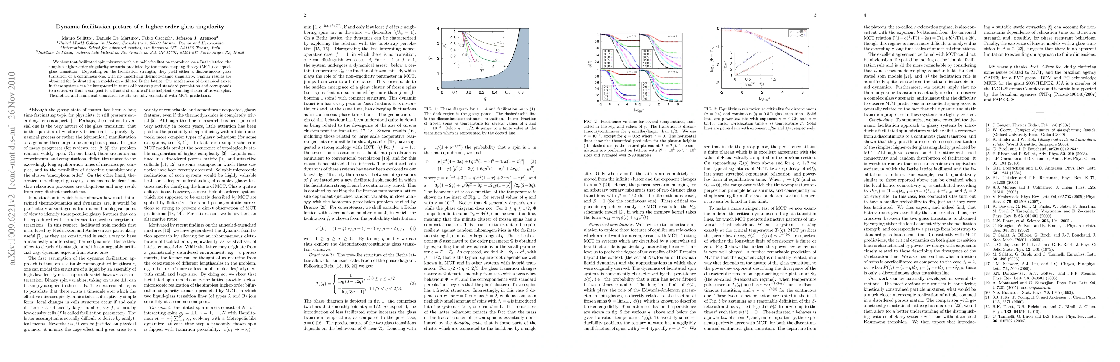 Researchers found that adding facilitation to spin mixtures on a Bethe lattice can reproduce the simplest higher-order glass singularity scenario predicted by mode-coupling theory, leading to either a hybrid or continuous transition with no underlying thermodynamic singularity.