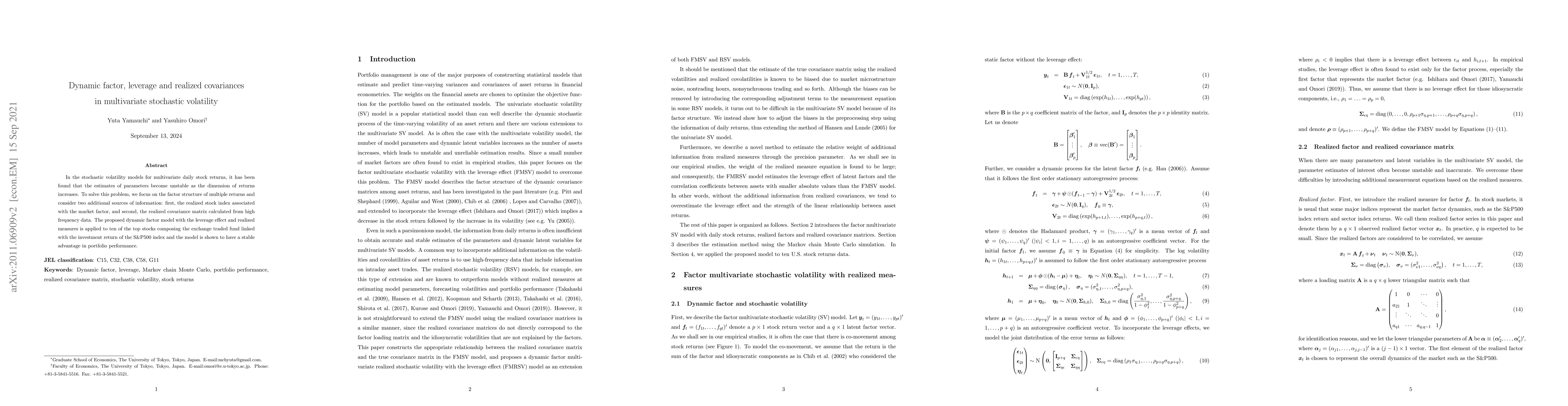 This paper proposes a dynamic factor model incorporating leverage and realized measures to stabilize parameter estimates in stochastic volatility models for multivariate stock returns. The model, applied to top SP500 stocks, demonstrates improved portfolio performance stability.