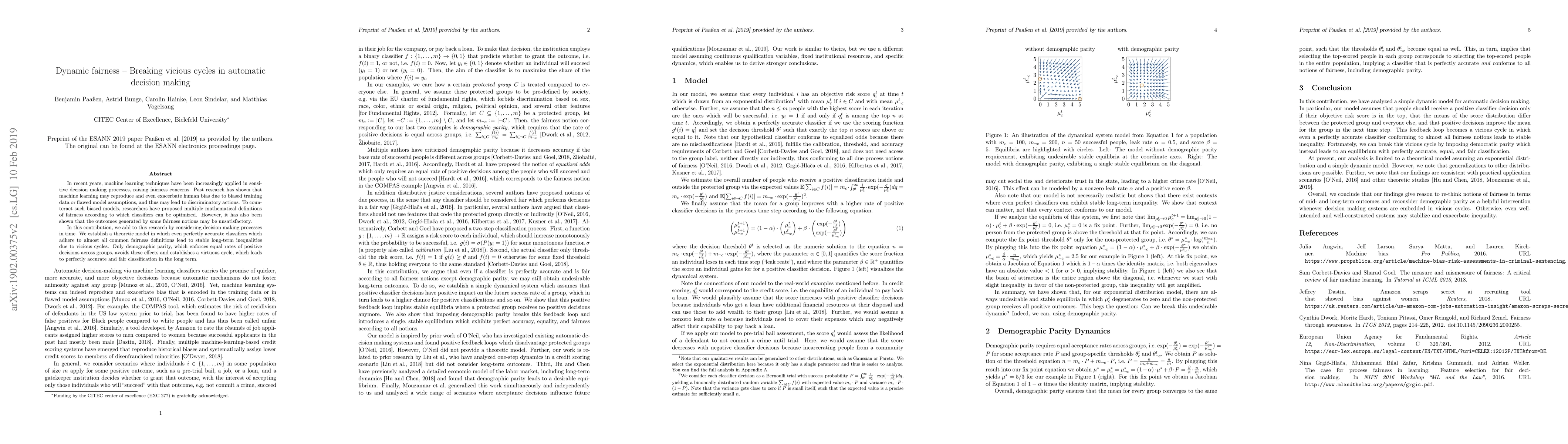 In recent years, machine learning techniques have been increasingly applied in sensitive decision making processes, raising fairness concerns. Past research has shown that machine learning may reproduce and even exacerbate human bias due to biased training data or flawed model assumptions, and thus may lead to discriminatory actions. To counteract such biased models, researchers have proposed multiple mathematical definitions of fairness according to which classifiers can be optimized. However, it has also been shown that the outcomes generated by some fairness notions may be unsatisfactory. In this contribution, we add to this research by considering decision making processes in time. We establish a theoretic model in which even perfectly accurate classifiers which adhere to almost all common fairness definitions lead to stable long-term inequalities due to vicious cycles. Only demographic parity, which enforces equal rates of positive decisions across groups, avoids these effects and establishes a virtuous cycle, which leads to perfectly accurate and fair classification in the long term.