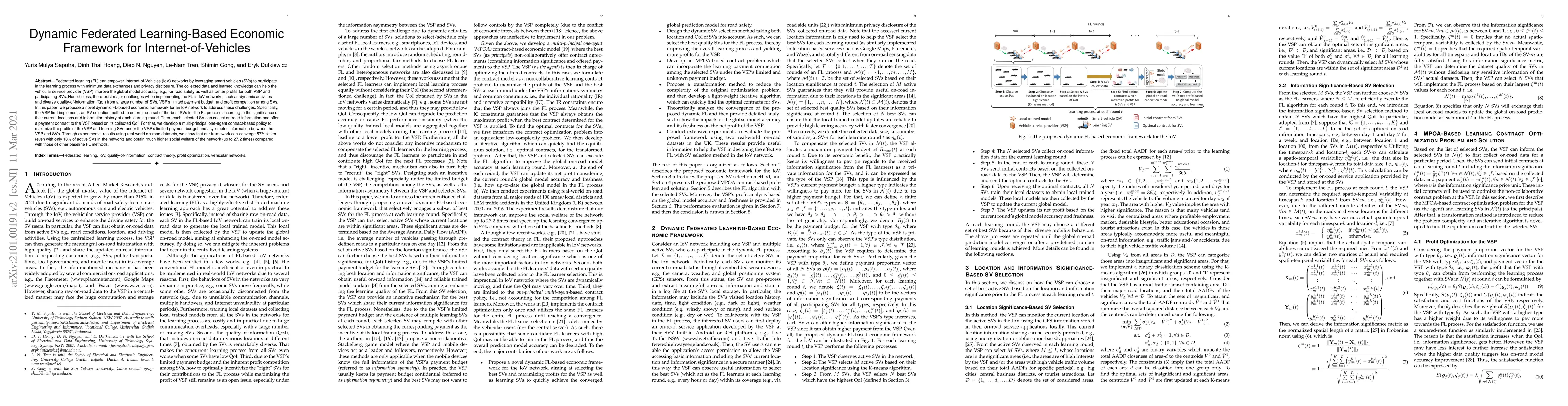 This paper proposes a dynamic federated learning-based economic framework for Internet-of-Vehicles (IoV) networks to enhance model accuracy and profitability. The framework selects optimal smart vehicles for federated learning, develops a contract policy to maximize profits under budget constraints, and achieves faster convergence and higher social welfare compared to baseline methods.
