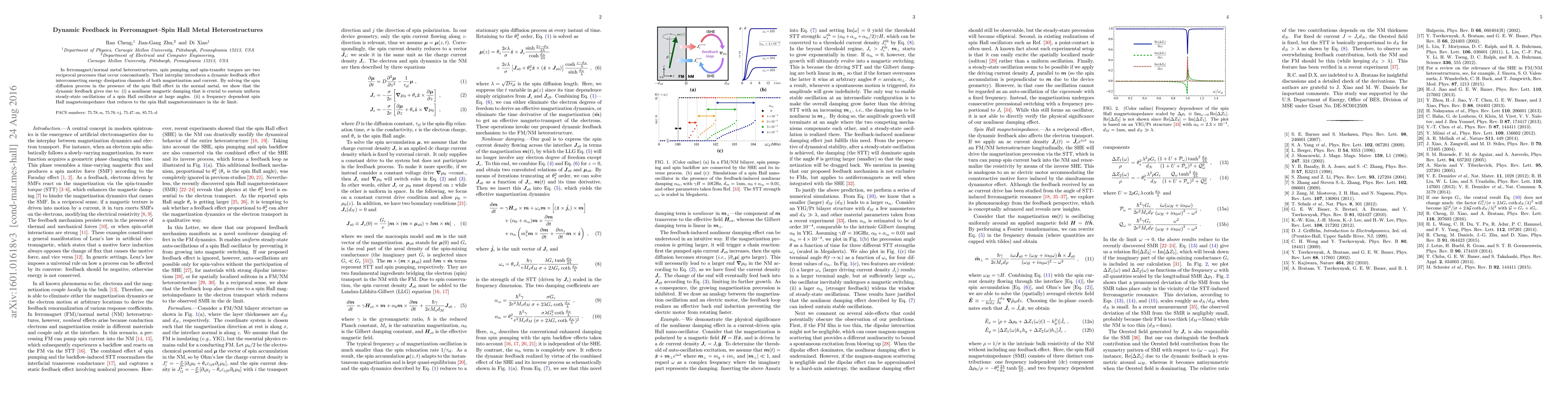 The paper presents a theoretical framework to describe the dynamic feedback effect in ferromagnet/spin Hall metal heterostructures, leading to novel insights into nonlinear magnetic damping and frequency-dependent spin Hall magnetoimpedance.