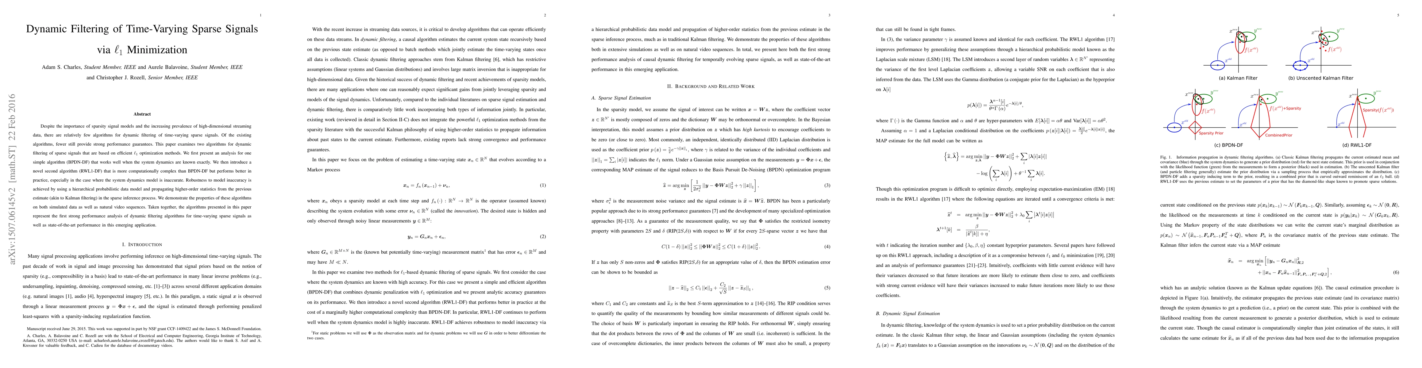 This paper proposes two dynamic filtering algorithms for time-varying sparse signals based on l1 optimization, with BPDN-DF performing well when system dynamics are known and RWL1-DF offering robustness to model inaccuracies through a hierarchical probabilistic model. The algorithms achieve state-of-the-art performance in filtering high-dimensional streaming data.