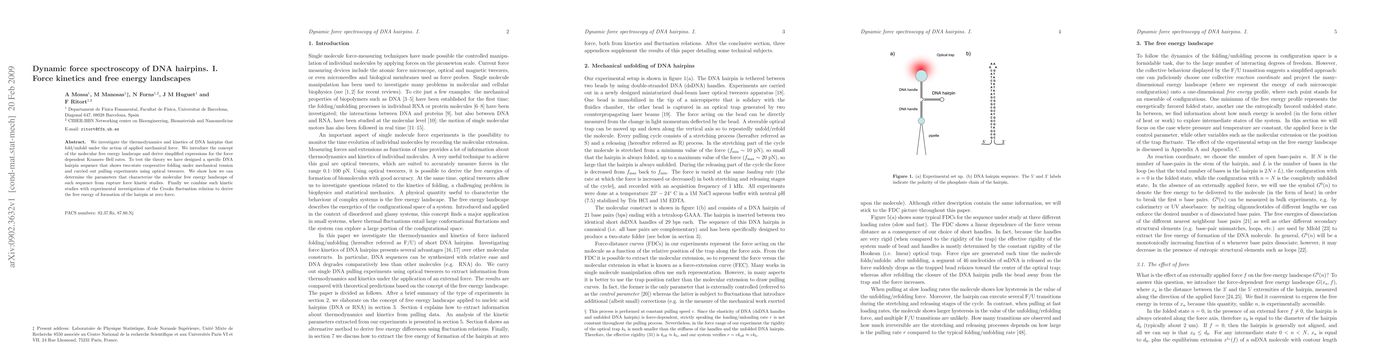 This paper explores the thermodynamics and kinetics of DNA hairpin folding/unfolding under mechanical force, introducing the molecular free energy landscape concept. Using optical tweezers, it demonstrates how to determine the free energy landscape parameters from rupture force kinetics and combines these with fluctuation relation experiments to derive the hairpin's free energy at zero force.