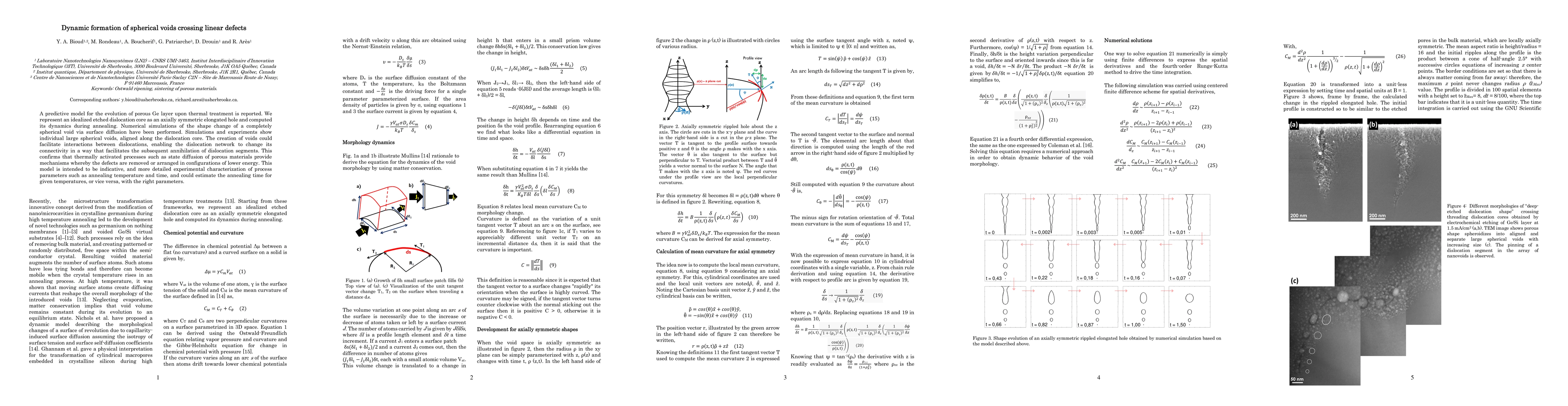 A predictive model for the evolution of porous Ge layer upon thermal treatment is reported. We represent an idealized etched dislocation core as an axially symmetric elongated hole and computed its dynamics during annealing. Numerical simulations of the shape change of a completely spherical void via surface diffusion have been performed. Simulations and experiments show individual large spherical voids, aligned along the dislocation core. The creation of voids could facilitate interactions between dislocations, enabling the dislocation network to change its connectivity in a way that facilitates the subsequent annihilation of dislocation segments. This confirms that thermally activated processes such as state diffusion of porous materials provide mechanisms whereby the defects are removed or arranged in configurations of lower energy. This model is intended to be indicative, and more detailed experimental characterization of process parameters such as annealing temperature and time, and could estimate the annealing time for given temperatures, or vice versa, with the right parameters.
