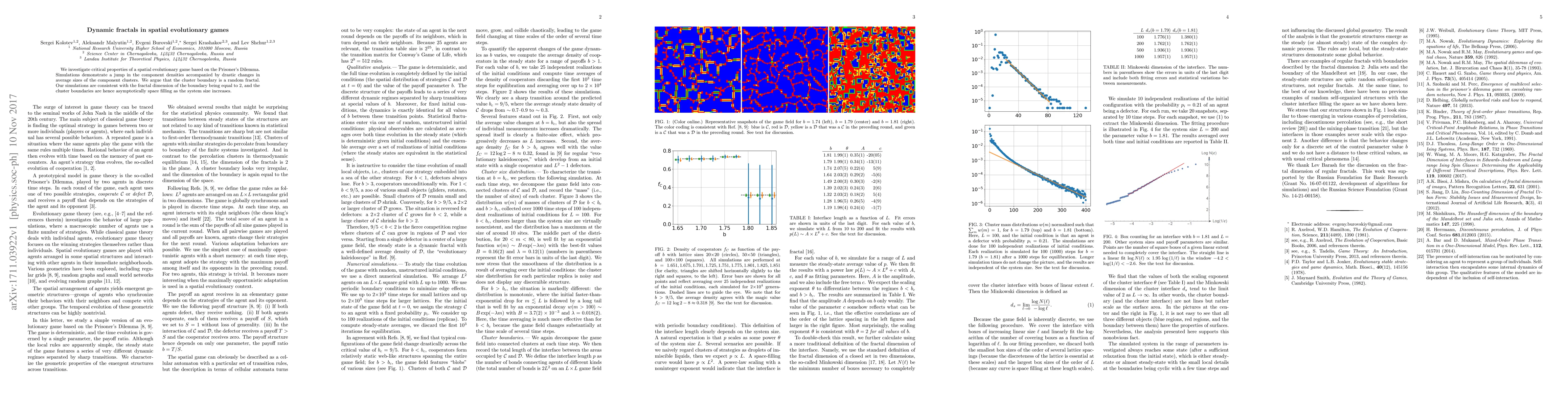 We investigate critical properties of a spatial evolutionary game based on the Prisoner's Dilemma. Simulations demonstrate a jump in the component densities accompanied by drastic changes in average sizes of the component clusters. We argue that the cluster boundary is a random fractal. Our simulations are consistent with the fractal dimension of the boundary being equal to 2, and the cluster boundaries are hence asymptotically space filling as the system size increases.