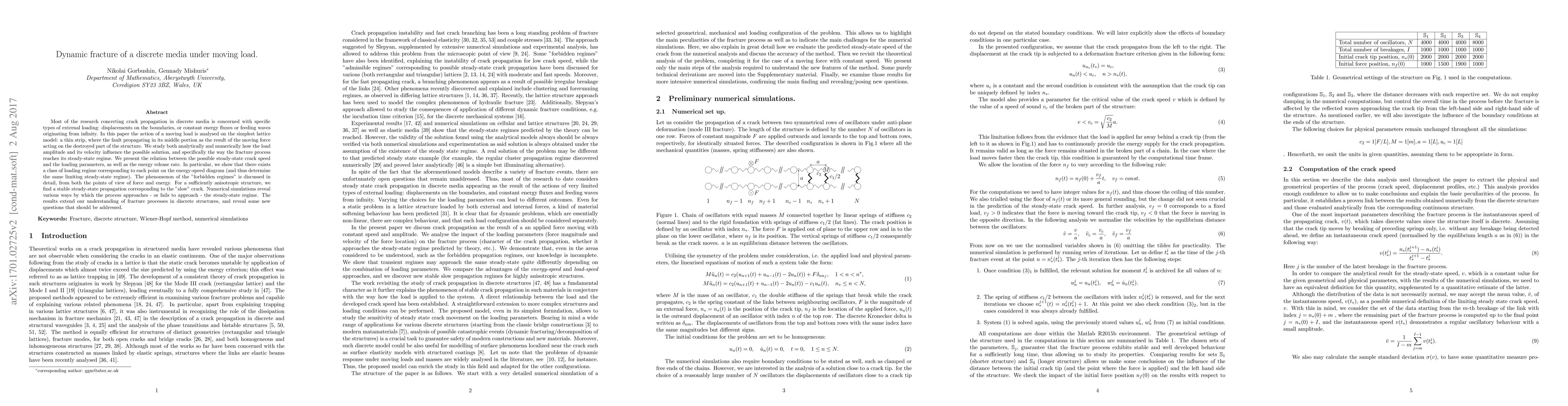 This paper investigates the dynamic fracture in a discrete lattice model under a moving load, analyzing how load amplitude and velocity influence crack propagation. It reveals a steady-state crack speed dependent on loading parameters and energy release rate, highlighting forbidden regimes and anisotropic structure effects.