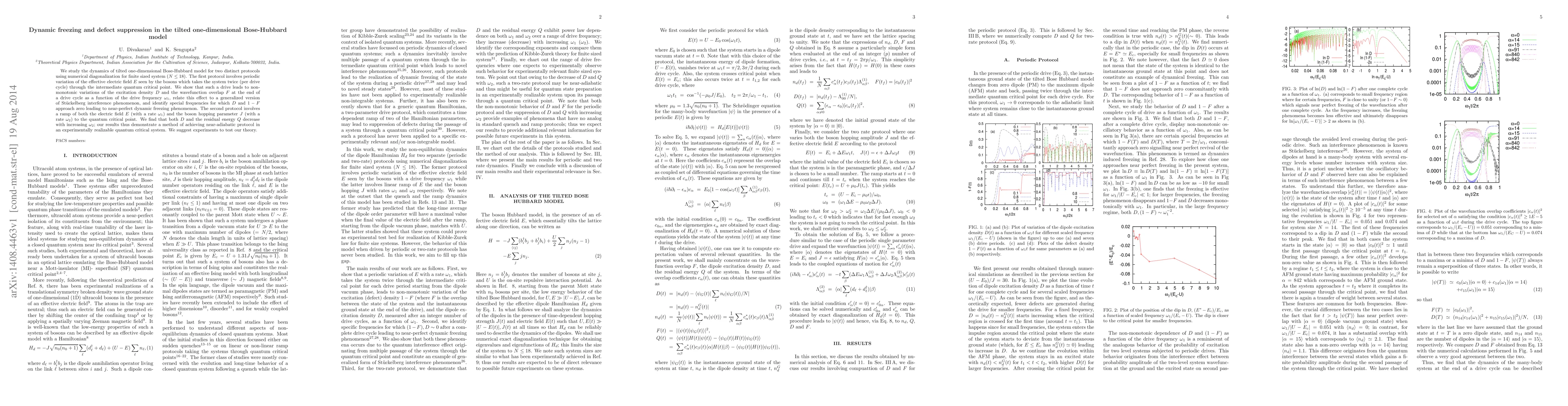 We study the dynamics of tilted one-dimensional Bose-Hubbard model for two distinct protocols using numerical diagonalization for finite sized system ($N\le 18$). The first protocol involves periodic variation of the effective electric field $E$ seen by the bosons which takes the system twice (per drive cycle) through the intermediate quantum critical point. We show that such a drive leads to non-monotonic variations of the excitation density $D$ and the wavefunction overlap $F$ at the end of a drive cycle as a function of the drive frequency $\omega_1$, relate this effect to a generalized version of St\"uckelberg interference phenomenon, and identify special frequencies for which $D$ and $1-F$ approach zero leading to near-perfect dynamic freezing phenomenon. The second protocol involves a ramp of both the electric field $E$ (with a rate $\omega_1$) and the boson hopping parameter $J$ (with a rate $\omega_2$) to the quantum critical point. We find that both $D$ and the residual energy $Q$ decrease with increasing $\omega_2$; our results thus demonstrate a method of achieving near-adiabatic protocol in an experimentally realizable quantum critical system. We suggest experiments to test our theory.