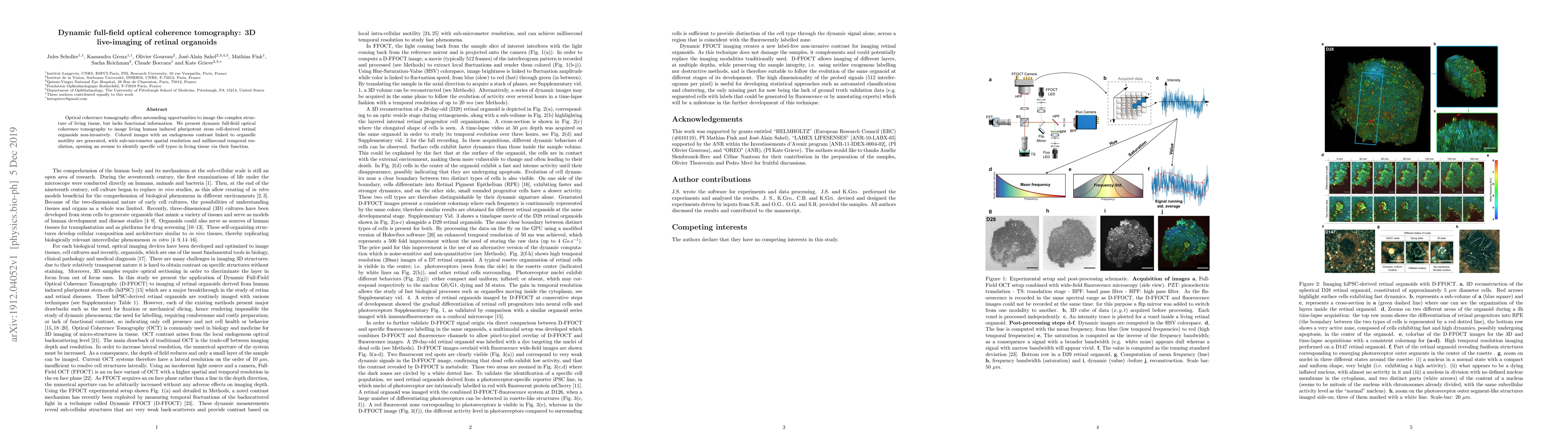 This paper introduces dynamic full-field optical coherence tomography for non-invasive 3D live-imaging of human retinal organoids, providing functional insights through organelle motility with sub-micrometer spatial and millisecond temporal resolution. This technique enables identification of specific cell types based on their functional characteristics.