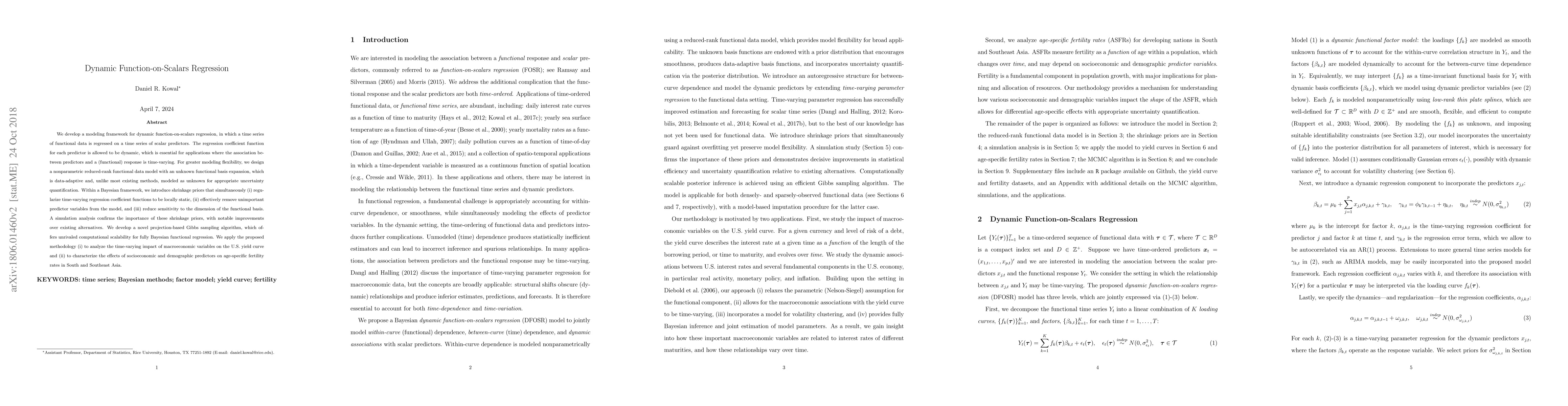 This paper develops a dynamic function-on-scalars regression framework to model time-varying relationships between functional data and scalar predictors, employing a Bayesian nonparametric reduced-rank model with shrinkage priors for regularization and computational efficiency. The method is applied to analyze macroeconomic impacts on the U.S. yield curve and socioeconomic effects on fertility rates in Asia.