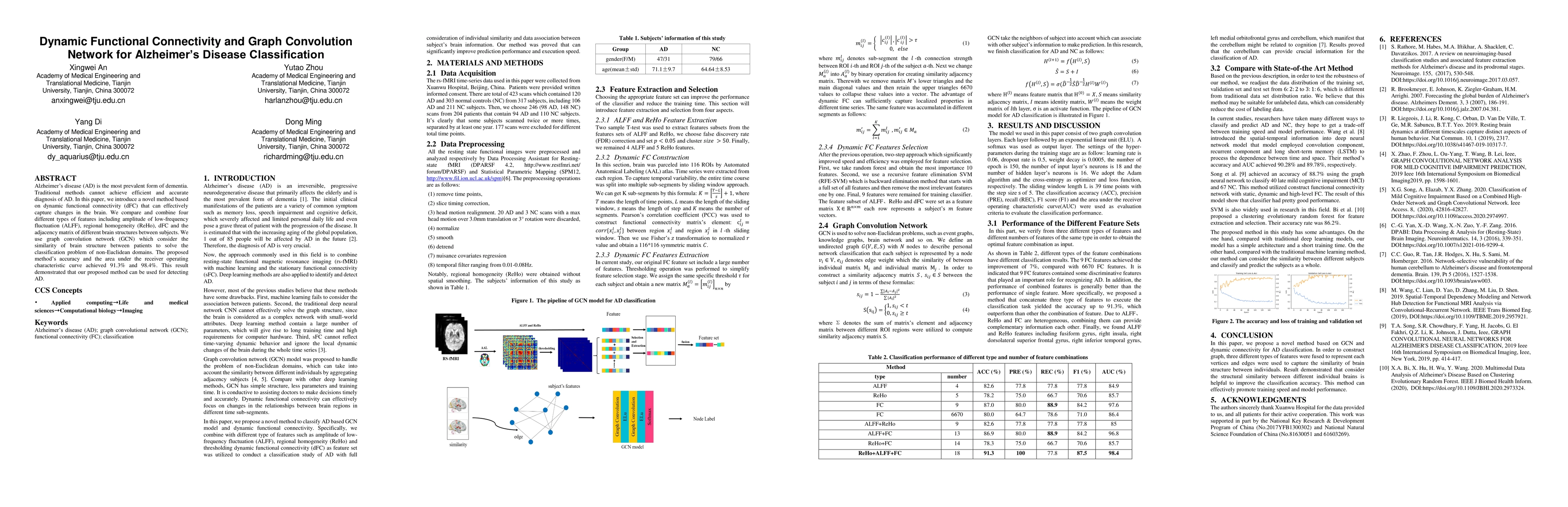 This paper proposes a novel method using dynamic functional connectivity and graph convolution networks to classify Alzheimer's disease. The method combines various brain imaging features and achieves high accuracy (91.3%) and AUC (98.4%) in detecting AD, demonstrating its potential for efficient diagnosis.