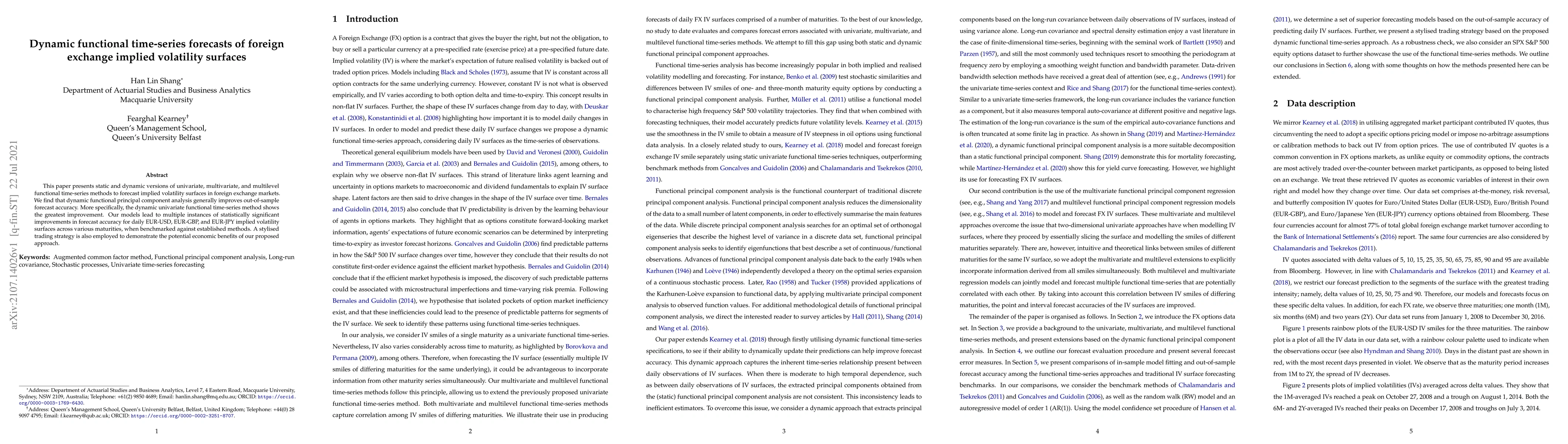 This paper presents static and dynamic versions of univariate, multivariate, and multilevel functional time-series methods to forecast implied volatility surfaces in foreign exchange markets. We find that dynamic functional principal component analysis generally improves out-of-sample forecast accuracy. More specifically, the dynamic univariate functional time-series method shows the greatest improvement. Our models lead to multiple instances of statistically significant improvements in forecast accuracy for daily EUR-USD, EUR-GBP, and EUR-JPY implied volatility surfaces across various maturities, when benchmarked against established methods. A stylised trading strategy is also employed to demonstrate the potential economic benefits of our proposed approach.