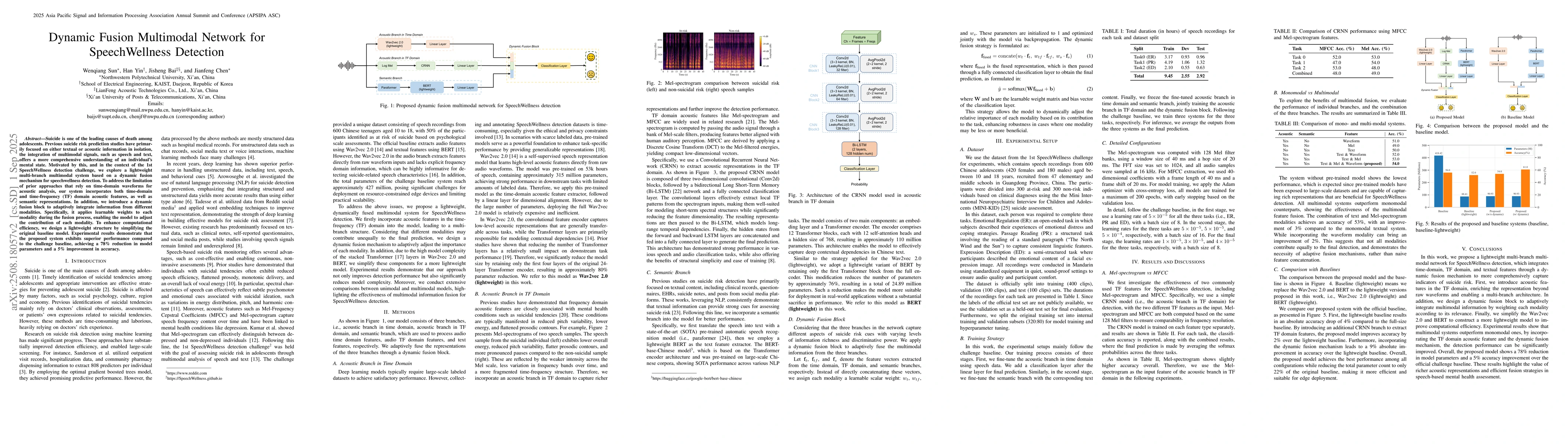 Suicide is one of the leading causes of death among adolescents. Previous suicide risk prediction studies have primarily focused on either textual or acoustic information in isolation, the integration of multimodal signals, such as speech and text, offers a more comprehensive understanding of an individual's mental state. Motivated by this, and in the context of the 1st SpeechWellness detection challenge, we explore a lightweight multi-branch multimodal system based on a dynamic fusion mechanism for speechwellness detection. To address the limitation of prior approaches that rely on time-domain waveforms for acoustic analysis, our system incorporates both time-domain and time-frequency (TF) domain acoustic features, as well as semantic representations. In addition, we introduce a dynamic fusion block to adaptively integrate information from different modalities. Specifically, it applies learnable weights to each modality during the fusion process, enabling the model to adjust the contribution of each modality. To enhance computational efficiency, we design a lightweight structure by simplifying the original baseline model. Experimental results demonstrate that the proposed system exhibits superior performance compared to the challenge baseline, achieving a 78% reduction in model parameters and a 5% improvement in accuracy.