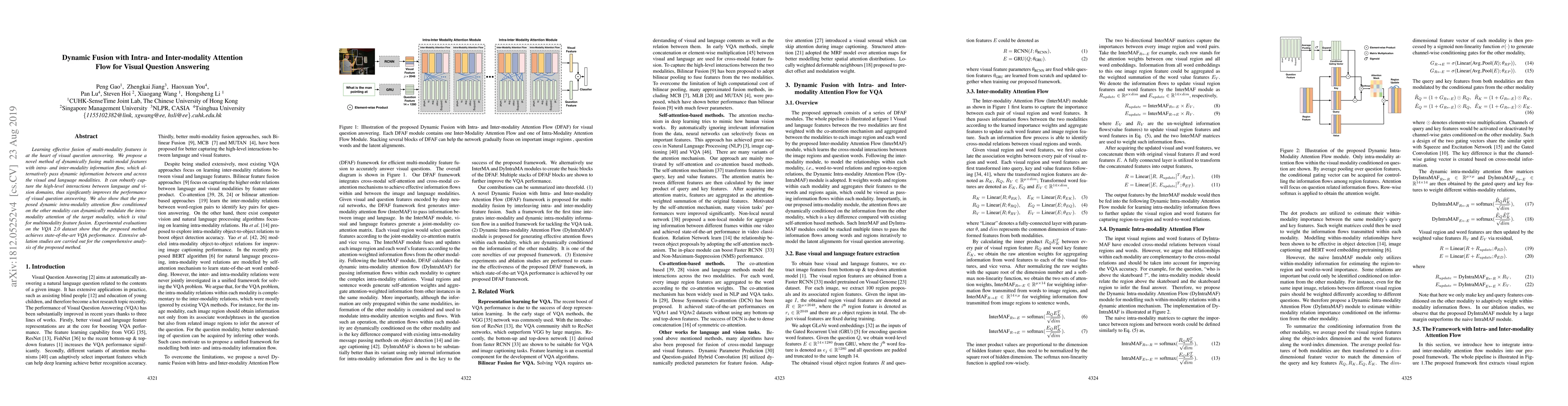 The paper proposes a dynamic fusion method for visual question answering that uses intra- and inter-modality attention flows to pass dynamic information between visual and language modalities, significantly improving VQA performance. Experimental results on the VQA 2.0 dataset demonstrate state-of-the-art performance and ablation studies provide a thorough analysis of the method's components.