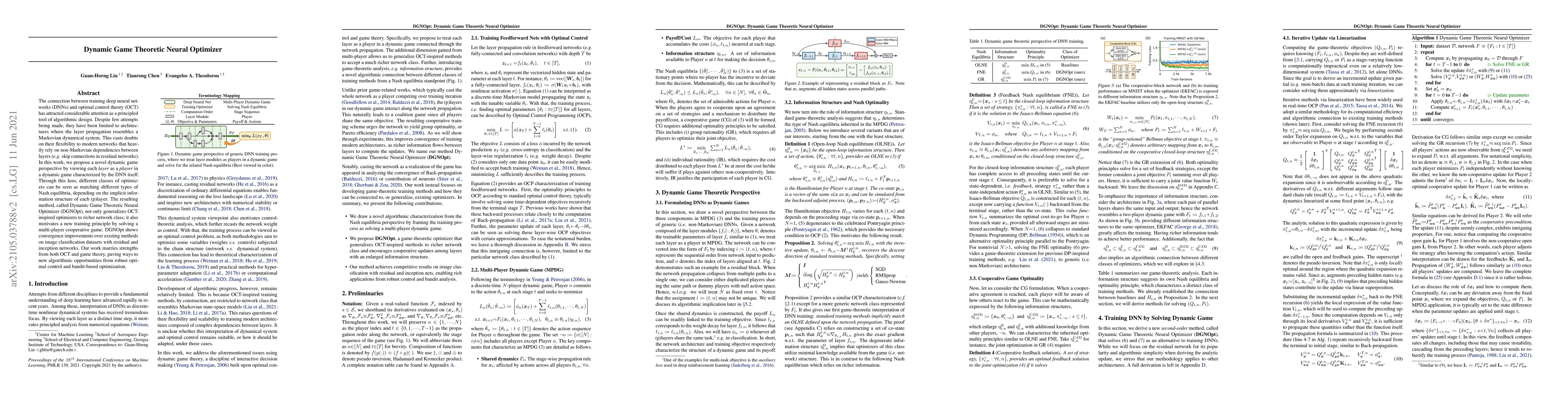 The paper proposes Dynamic Game Theoretic Neural Optimizer (DGNOpt) that views each layer of a DNN as a player in a dynamic game, generalizing OCT-inspired optimizers to richer network classes and motivating a new training principle by solving a multi-player cooperative game.
