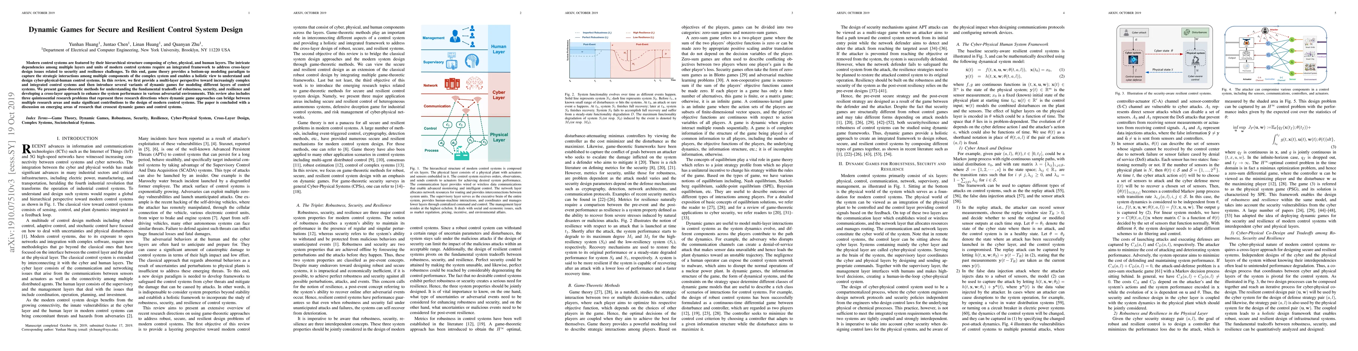 This paper reviews the application of dynamic games to model and enhance the security and resilience of modern control systems, which are complex and hierarchical. It introduces game-theoretic methods for addressing cross-layer design challenges and discusses three key research problems that highlight dynamic game approaches' potential contributions to control systems.