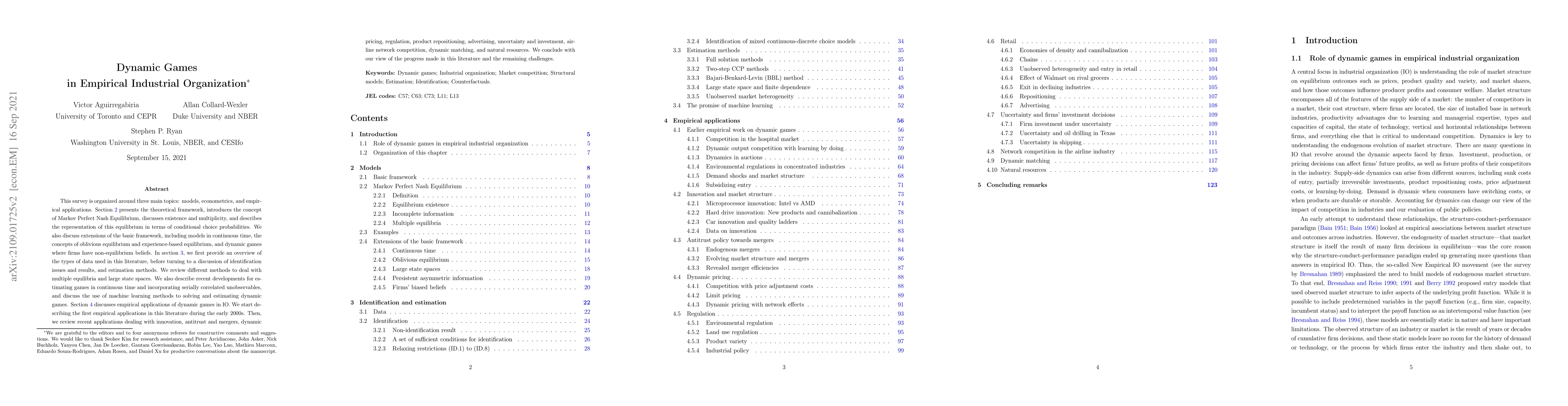 This survey explores dynamic games in industrial organization, covering theoretical frameworks, econometric methods, and empirical applications, with a focus on innovation, antitrust, mergers, and regulation.