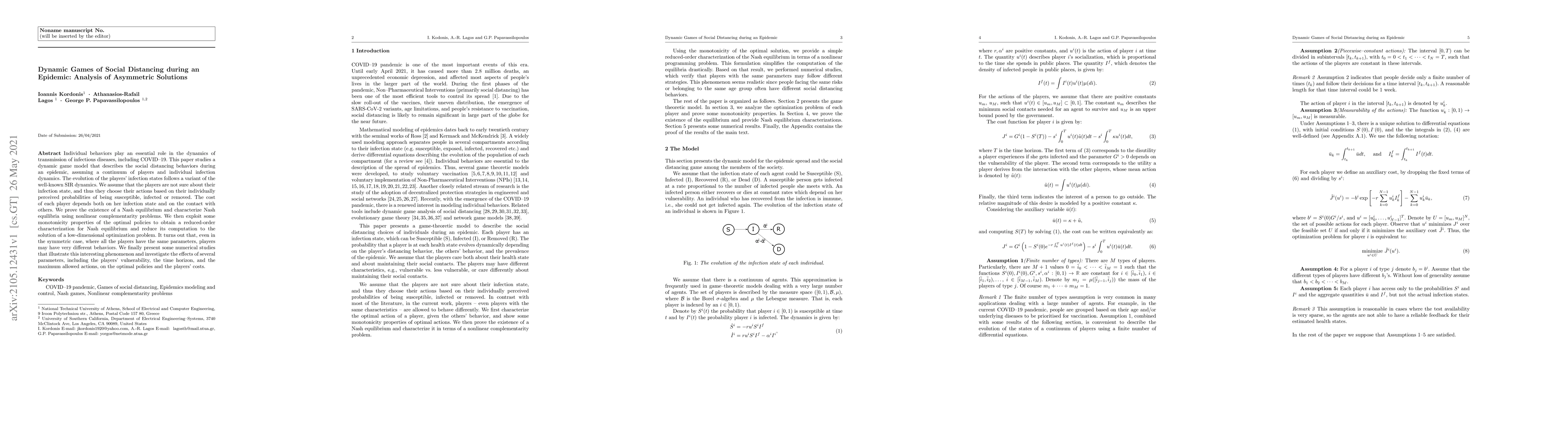 Individual behaviors play an essential role in the dynamics of transmission of infectious diseases, including COVID--19. This paper studies a dynamic game model that describes the social distancing behaviors during an epidemic, assuming a continuum of players and individual infection dynamics. The evolution of the players' infection states follows a variant of the well-known SIR dynamics. We assume that the players are not sure about their infection state, and thus they choose their actions based on their individually perceived probabilities of being susceptible, infected or removed. The cost of each player depends both on her infection state and on the contact with others. We prove the existence of a Nash equilibrium and characterize Nash equilibria using nonlinear complementarity problems. We then exploit some monotonicity properties of the optimal policies to obtain a reduced-order characterization for Nash equilibrium and reduce its computation to the solution of a low-dimensional optimization problem. It turns out that, even in the symmetric case, where all the players have the same parameters, players may have very different behaviors. We finally present some numerical studies that illustrate this interesting phenomenon and investigate the effects of several parameters, including the players' vulnerability, the time horizon, and the maximum allowed actions, on the optimal policies and the players' costs.