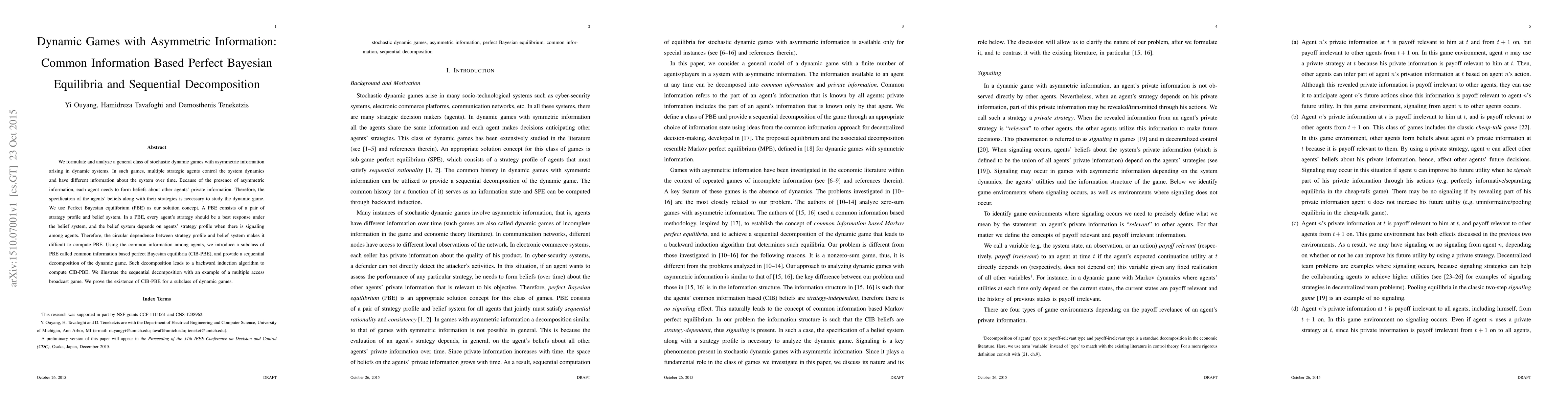 The paper formulates and analyzes a general class of stochastic dynamic games with asymmetric information, using Perfect Bayesian equilibrium (PBE) as the solution concept. It introduces a subclass called Common Information Based Perfect Bayesian Equilibria (CIB-PBE) and provides a sequential decomposition leading to a backward induction algorithm for computing CIB-PBE.