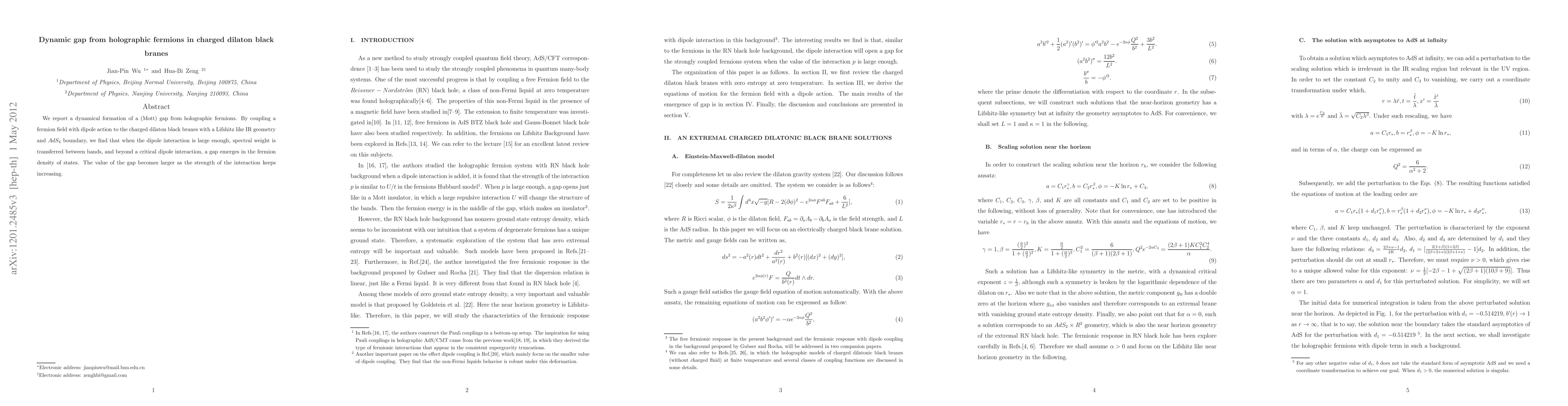 This paper investigates the dynamic emergence of a Mott gap in holographic fermions coupled to charged dilaton black branes, revealing that a large enough dipole interaction induces spectral weight transfer between bands, resulting in a gap in the fermion density of states that grows with interaction strength.