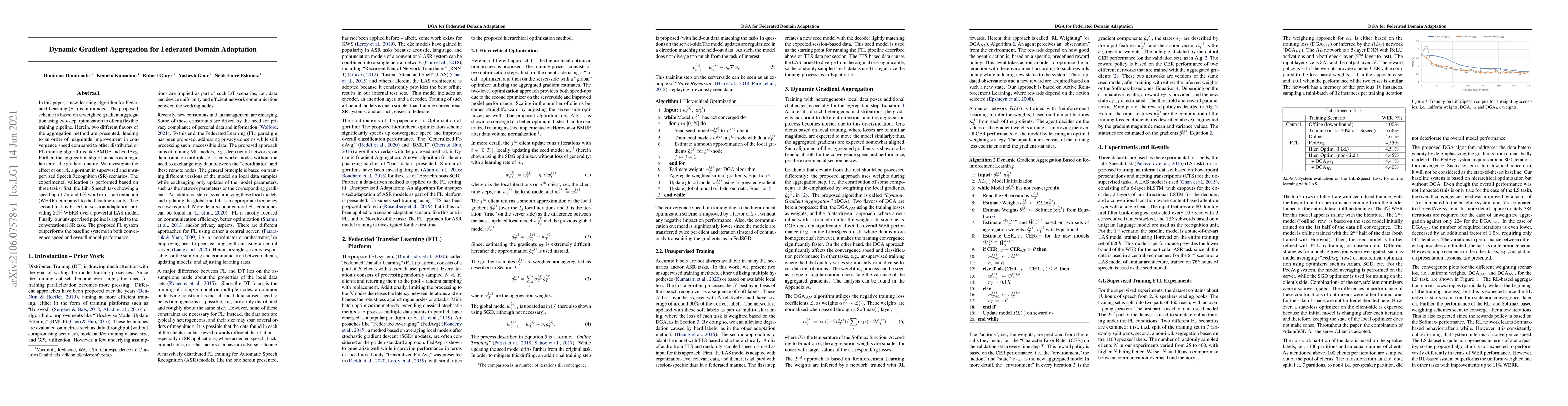 In this paper, a new learning algorithm for Federated Learning (FL) is introduced. The proposed scheme is based on a weighted gradient aggregation using two-step optimization to offer a flexible training pipeline. Herein, two different flavors of the aggregation method are presented, leading to an order of magnitude improvement in convergence speed compared to other distributed or FL training algorithms like BMUF and FedAvg. Further, the aggregation algorithm acts as a regularizer of the gradient quality. We investigate the effect of our FL algorithm in supervised and unsupervised Speech Recognition (SR) scenarios. The experimental validation is performed based on three tasks: first, the LibriSpeech task showing a speed-up of 7x and 6% word error rate reduction (WERR) compared to the baseline results. The second task is based on session adaptation providing 20% WERR over a powerful LAS model. Finally, our unsupervised pipeline is applied to the conversational SR task. The proposed FL system outperforms the baseline systems in both convergence speed and overall model performance.