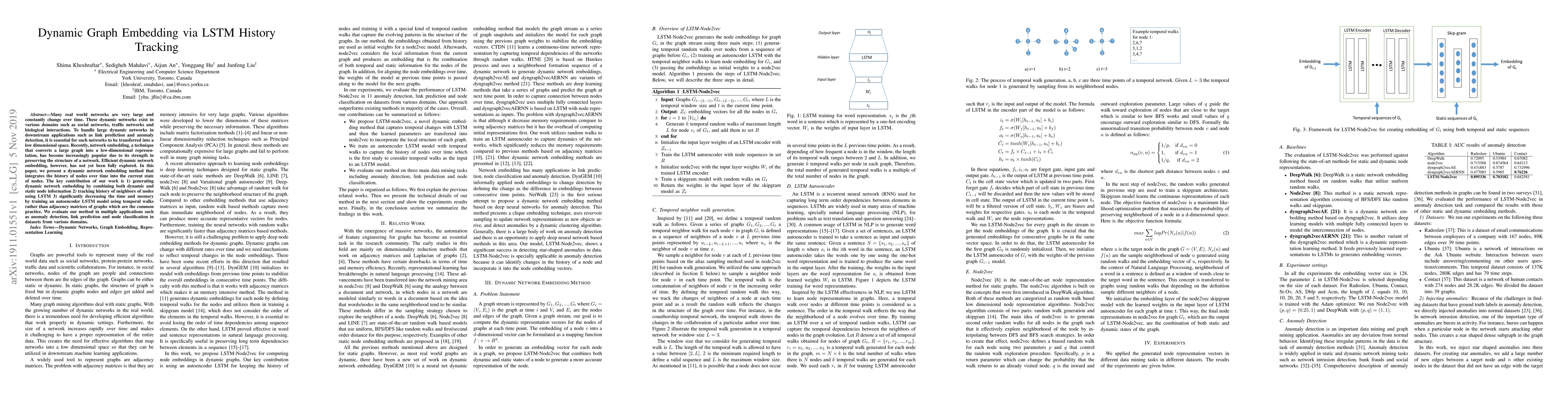 This paper proposes a dynamic network embedding method that leverages LSTM history tracking to integrate temporal node information, significantly reducing training time and memory. The method is evaluated for applications like anomaly detection and link prediction, showing improved performance.