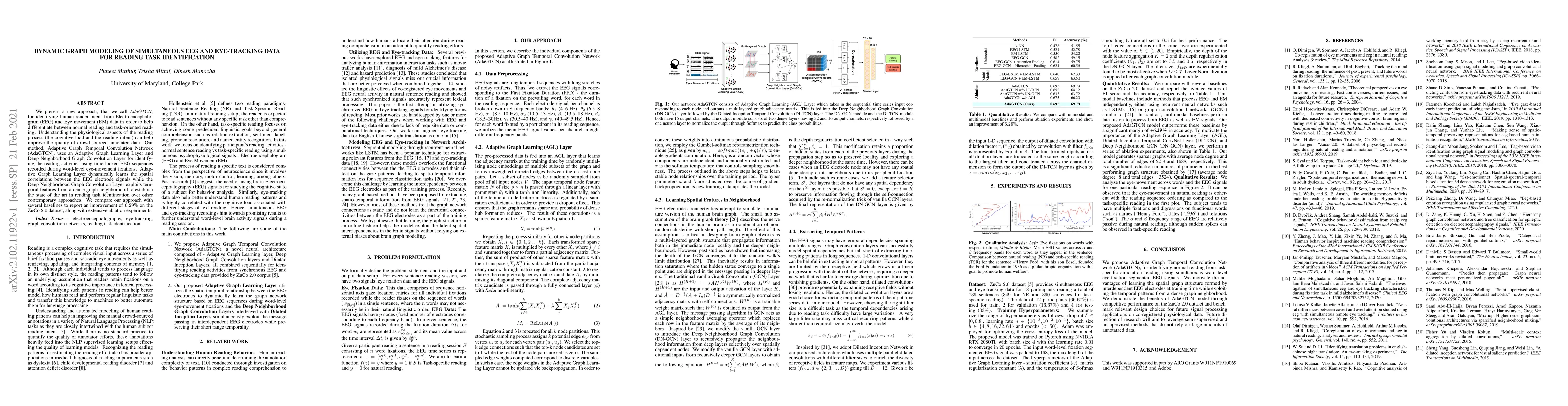We present a new approach, that we call AdaGTCN, for identifying human reader intent from Electroencephalogram~(EEG) and Eye movement~(EM) data in order to help differentiate between normal reading and task-oriented reading. Understanding the physiological aspects of the reading process~(the cognitive load and the reading intent) can help improve the quality of crowd-sourced annotated data. Our method, Adaptive Graph Temporal Convolution Network (AdaGTCN), uses an Adaptive Graph Learning Layer and Deep Neighborhood Graph Convolution Layer for identifying the reading activities using time-locked EEG sequences recorded during word-level eye-movement fixations. Adaptive Graph Learning Layer dynamically learns the spatial correlations between the EEG electrode signals while the Deep Neighborhood Graph Convolution Layer exploits temporal features from a dense graph neighborhood to establish the state of the art in reading task identification over other contemporary approaches. We compare our approach with several baselines to report an improvement of 6.29% on the ZuCo 2.0 dataset, along with extensive ablation experiments