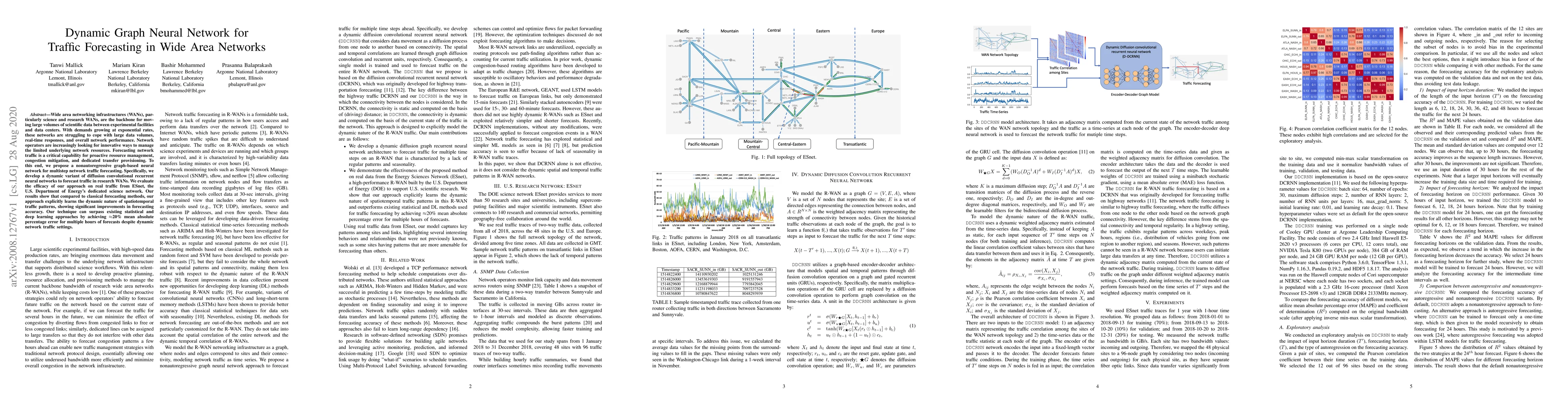 This paper proposes a dynamic graph neural network for forecasting traffic in wide area networks (WANs), specifically for science and research networks. The developed model, a variant of diffusion convolutional recurrent neural networks, significantly improves forecasting accuracy over classical methods, achieving around 20% mean absolute percentage error for multi-hour forecasts.