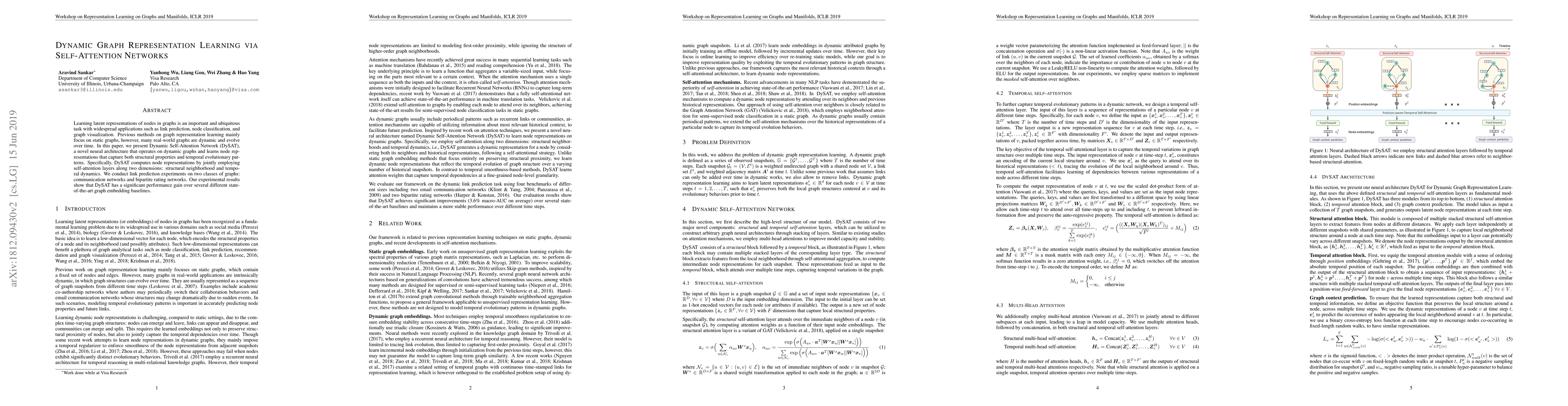 This paper introduces DySAT, a novel neural architecture for learning dynamic graph representations that captures both structural and temporal patterns. DySAT employs self-attention mechanisms to integrate neighborhood and temporal dynamics, achieving superior performance in link prediction tasks on communication and bipartite rating networks compared to state-of-the-art graph embedding methods.