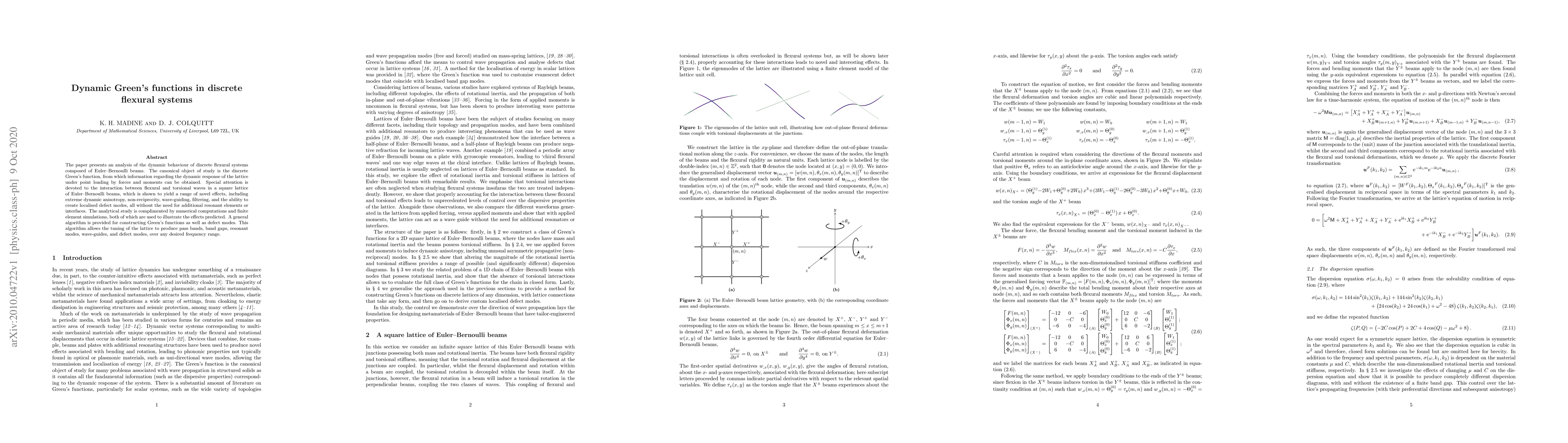 The paper presents an analysis of the dynamic behaviour of discrete flexural systems composed of Euler--Bernoulli beams. The canonical object of study is the discrete Green's function, from which information regarding the dynamic response of the lattice under point loading by forces and moments can be obtained. Special attention is devoted to the interaction between flexural and torsional waves in a square lattice of Euler--Bernoulli beams, which is shown to yield a range of novel effects, including extreme dynamic anisotropy, non-reciprocity, wave-guiding, filtering, and the ability to create localised defect modes, all without the need for additional resonant elements or interfaces. The analytical study is complimented by numerical computations and finite element simulations, both of which are used to illustrate the effects predicted. A general algorithm is provided for constructing Green's functions as well as defect modes. This algorithm allows the tuning of the lattice to produce pass bands, band gaps, resonant modes, wave-guides, and defect modes, over any desired frequency range.
