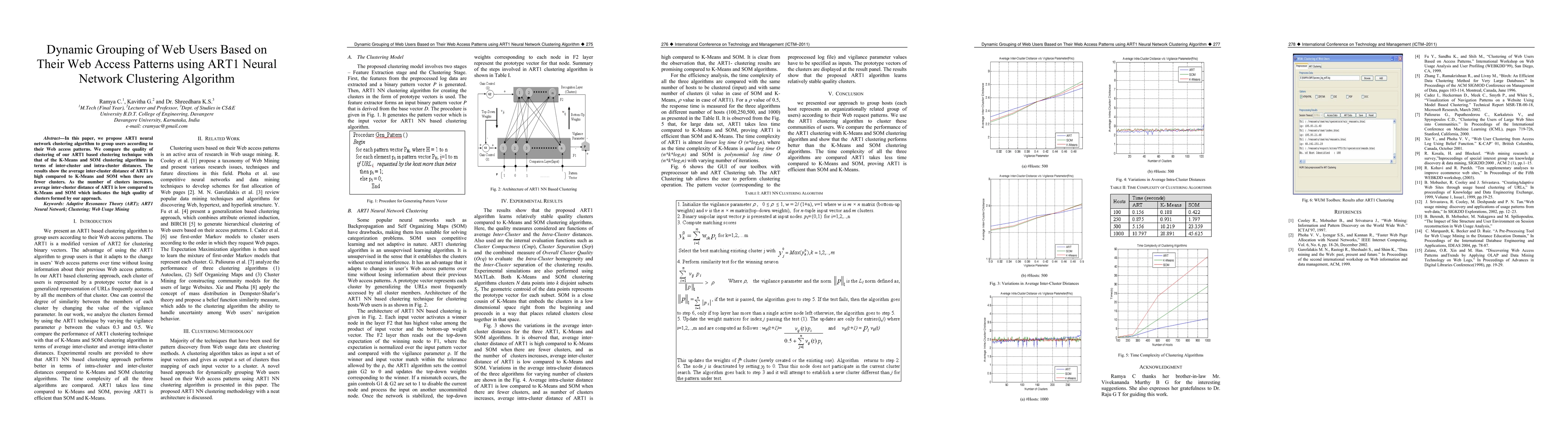 In this paper, we propose ART1 neural network clustering algorithm to group users according to their Web access patterns. We compare the quality of clustering of our ART1 based clustering technique with that of the K-Means and SOM clustering algorithms in terms of inter-cluster and intra-cluster distances. The results show the average inter-cluster distance of ART1 is high compared to K-Means and SOM when there are fewer clusters. As the number of clusters increases, average inter-cluster distance of ART1 is low compared to K-Means and SOM which indicates the high quality of clusters formed by our approach.