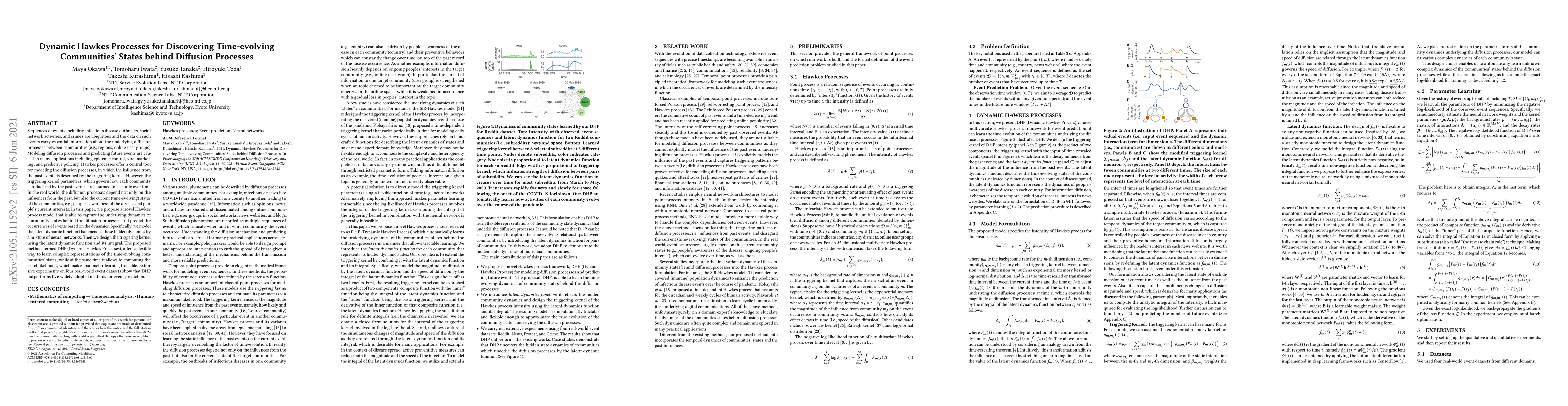 This paper proposes a Dynamic Hawkes Processes (DHP) model to capture time-evolving community states influencing diffusion processes, using a mixture of neural networks to encode latent dynamics. DHP outperforms existing methods in predicting events across various real-world datasets.