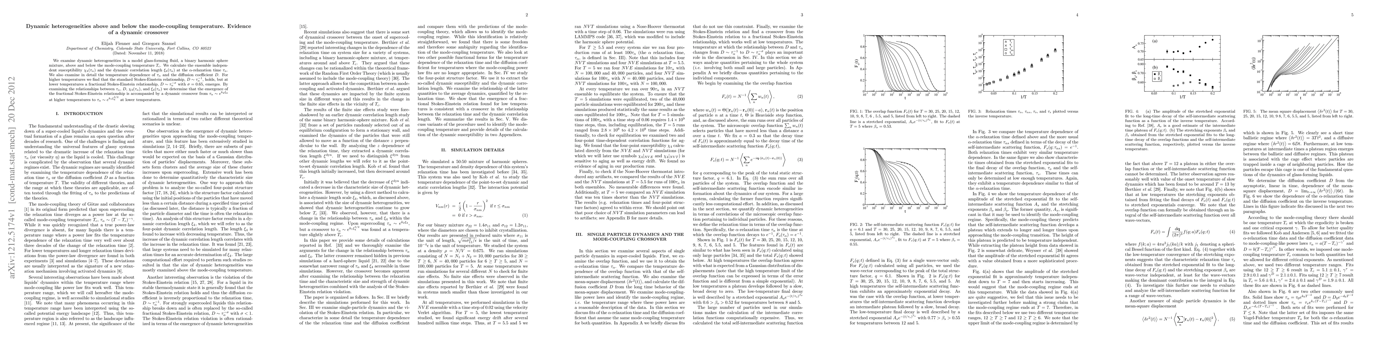We examine dynamic heterogeneities in a model glass-forming fluid, a binary harmonic sphere mixture, above and below the mode-coupling temperature T_c. We calculate the ensemble independent susceptibility chi_4(tau_alpha) and the dynamic correlation length xi_4(tau_alpha) at the alpha-relaxation time tau_alpha. We also examine in detail the temperature dependence of tau_alpha and the diffusion coefficient D. For higher temperatures we find that the standard Stokes-Einstein relationship, D ~ tau_alpha^{-1}, holds, but at lower temperatures a fractional Stokes-Einstein relationship, D ~ tau_alpha^{-sigma} with sigma = 0.65, emerges. By examining the relationships between tau_alpha, D, chi_4(tau_alpha), and xi_4(tau_alpha) we determine that the emergence of the fractional Stokes-Einstein relationship is accompanied by a dynamic crossover from tau_alpha ~ e^{k_2 xi_4} at higher temperatures to tau_alpha ~ e^{k_1 xi_4^{3/2}} at lower temperatures.
