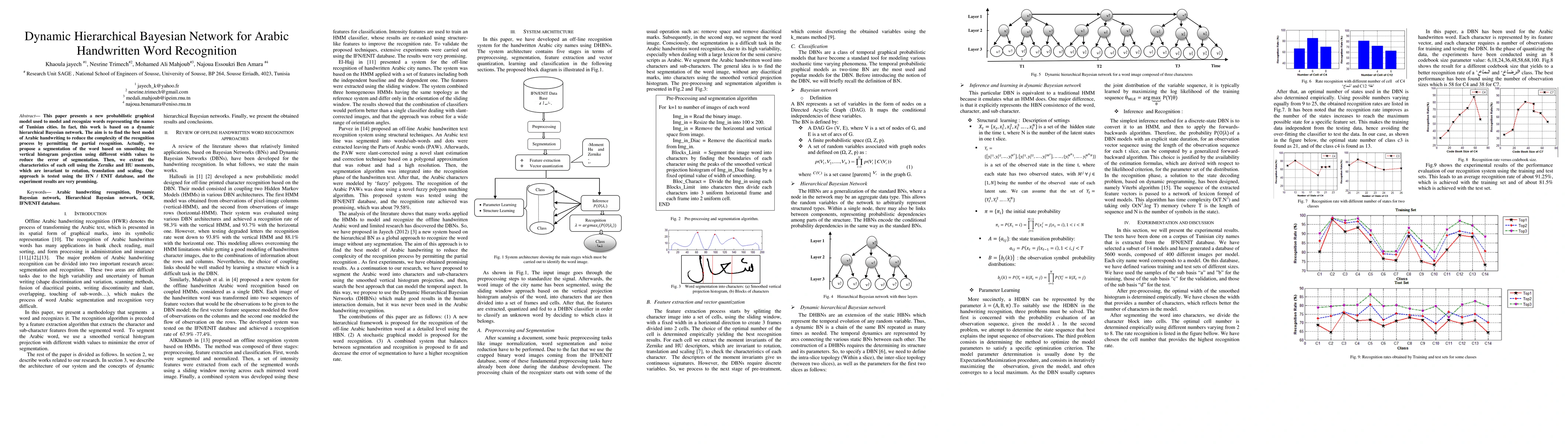 This paper presents a new probabilistic graphical model used to model and recognize words representing the names of Tunisian cities. In fact, this work is based on a dynamic hierarchical Bayesian network. The aim is to find the best model of Arabic handwriting to reduce the complexity of the recognition process by permitting the partial recognition. Actually, we propose a segmentation of the word based on smoothing the vertical histogram projection using different width values to reduce the error of segmentation. Then, we extract the characteristics of each cell using the Zernike and HU moments, which are invariant to rotation, translation and scaling. Our approach is tested using the IFN / ENIT database, and the experiment results are very promising.